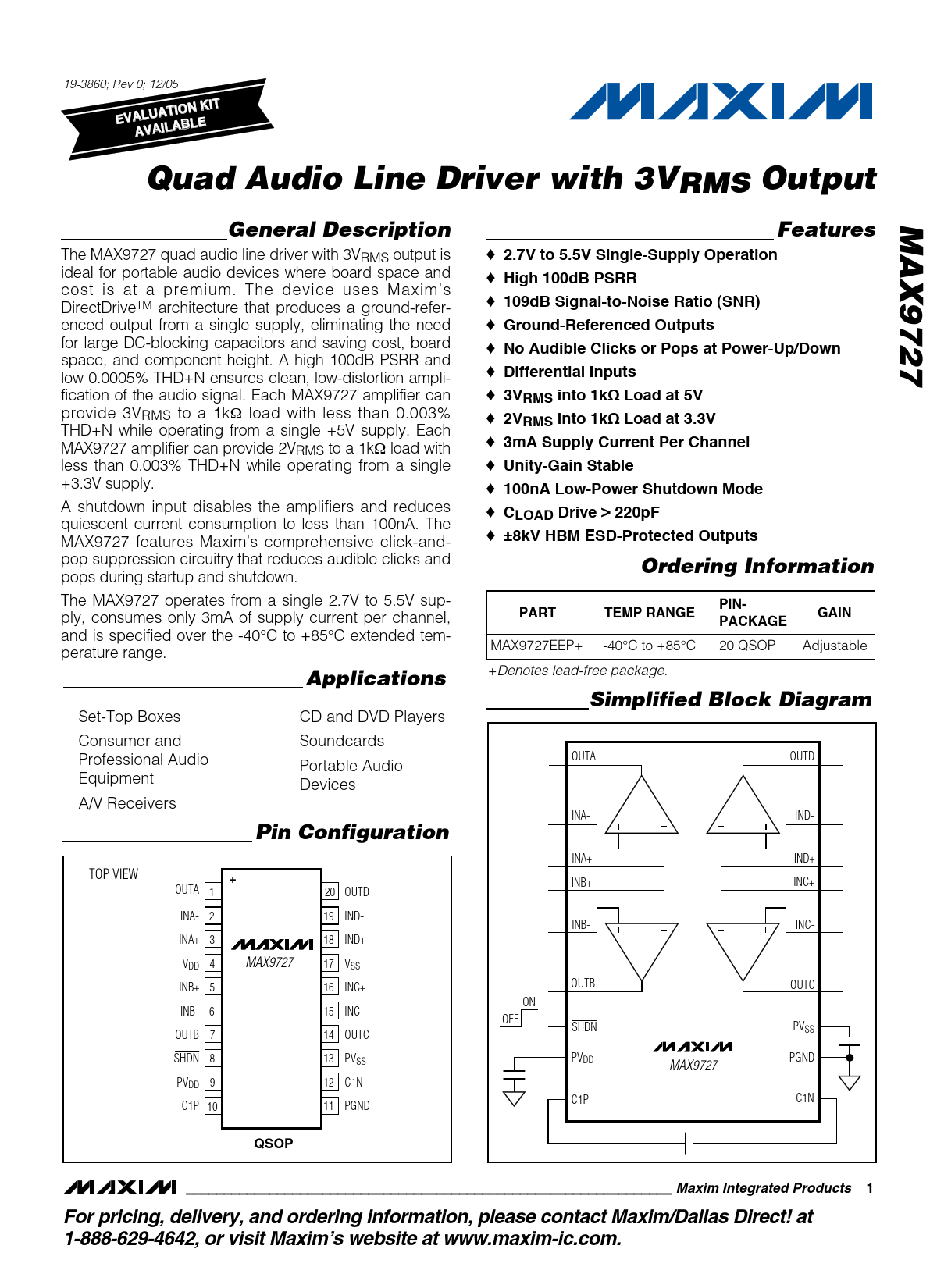 EVALUATION KIT. AVAILABLE. Quad Audio Line Driver with 3VRMS Output. MAX9727. General Description. Features