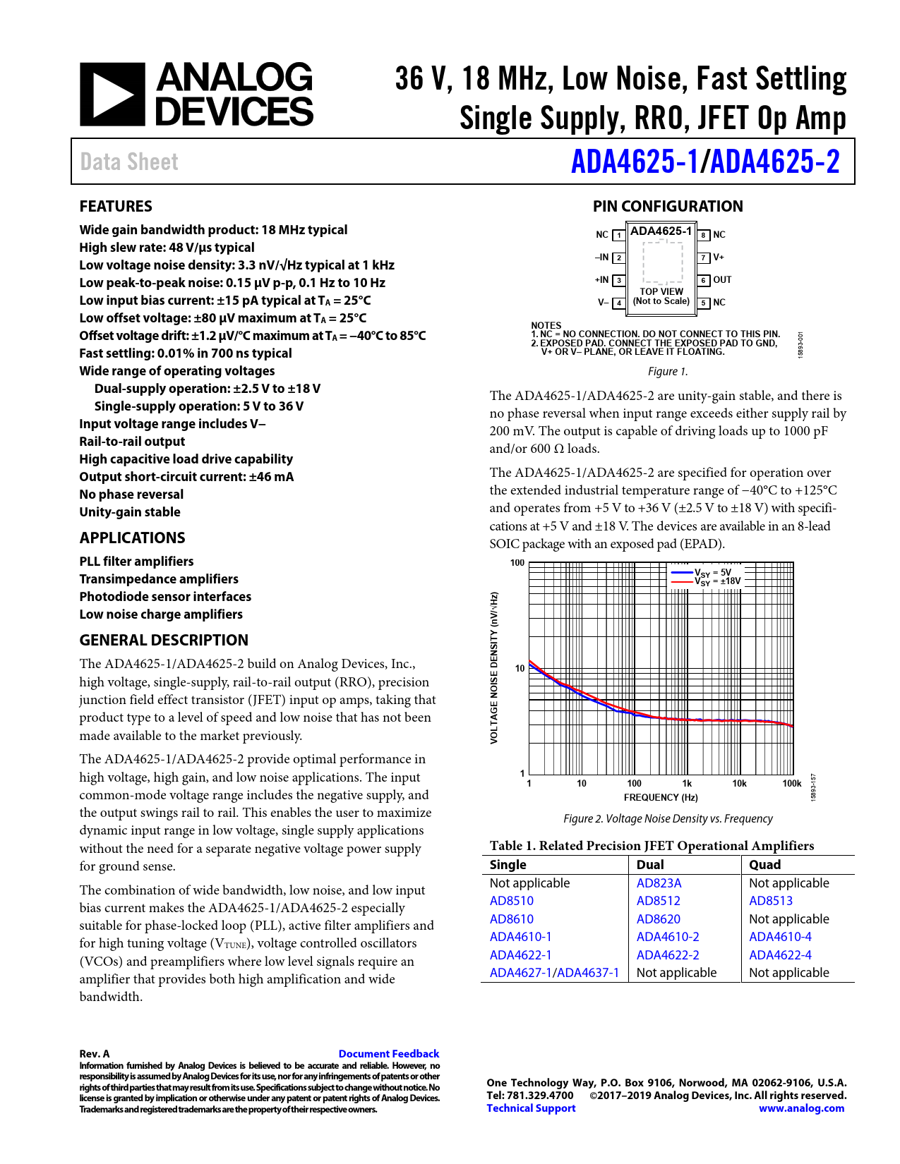36 V, 18 MHz, Low Noise, Fast Settling. Single Supply, RRO, JFET Op Amp. Data Sheet. ADA4625-1. /ADA4625-2. FEATURES