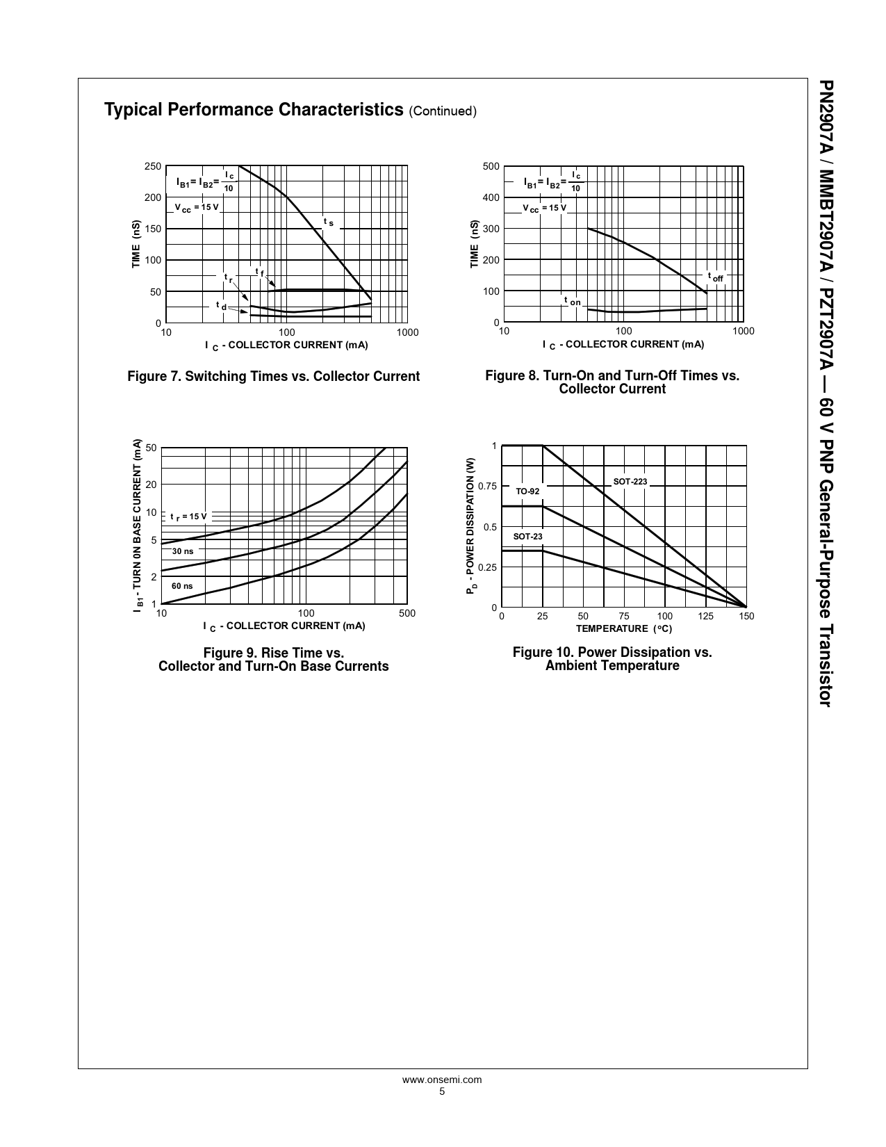 PN290Typical Performance Characteristics (Continued) 7A / MMBT2907A / PZT2 250 500 I cI cI = I =B1B2I = I =10B1B210 200 400 V = 15 VccV = 15 Vcc)t) 150 s 300 (nS(nSEEM 100 M 200 TITIttftroff 50 100 ttond 0 0 907A — 60 10 100 1000 10 100 1000 I - COLLECTOR CURRENT (mA)CI - COLLECTOR CURRENT (mA)CFigure 7. Switching Times vs. Collector CurrentFigure 8. Turn-On and Turn-Off Times vs.Collector CurrentV PNP Gene) A 50 1 (m) WENT 20 N ( 0.75 SOT-223IORRTTO-92ACU 10 IPEt = 15 VrraSISS 0.5 SOT-23l-Pu 5 R DN BA30 nsE W O 0.25 rpose TRN 0 2 - P60 nsD- TUPB1 1 I 10 100 500 0 0 25 50 75 100 125 150 I - COLLECTOR CURRENT (mA)CTEMPERATURE ( oC)ransistorFigure 9. Rise Time vs.Figure 10. Power Dissipation vs.Collector and Turn-On Base CurrentsAmbient Temperature www.onsemi.com 5