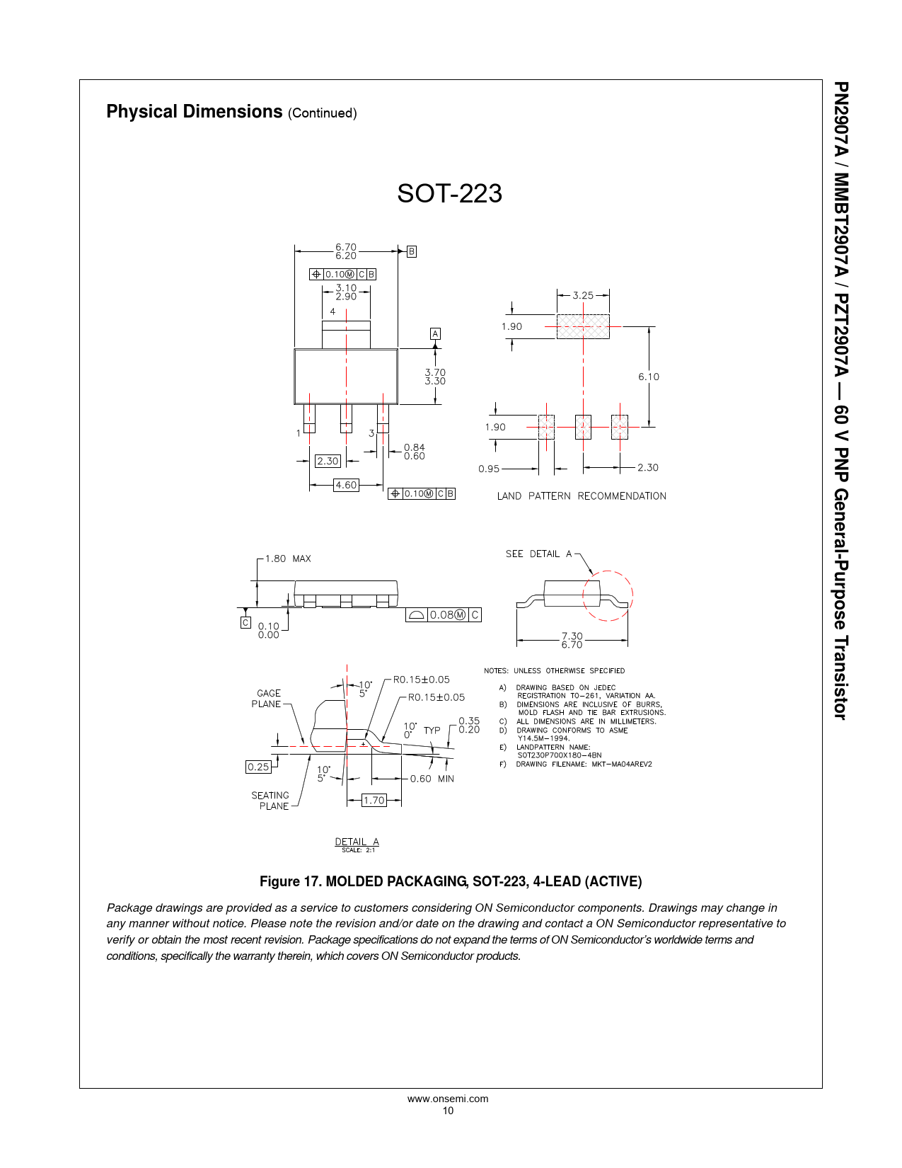 PN290Physical Dimensions (Continued) 7A / MMBT2907A / PZT2 SOT-223 907A — 60V PNP Genera l-Purpose TransistorFigure 17. MOLDED PACKAGING, SOT-223, 4-LEAD (ACTIVE) Package drawings are provided as a service to customers considering ON Semiconductor components. Drawings may change in any manner without notice. Please note the revision and/or date on the drawing and contact a ON Semiconductor representative to verify or obtain the most recent revision. Package specifications do not expand the terms of ON Semiconductor’s worldwide terms and conditions, specifically the warranty therein, which covers ON Semiconductor products. www.onsemi.com 10