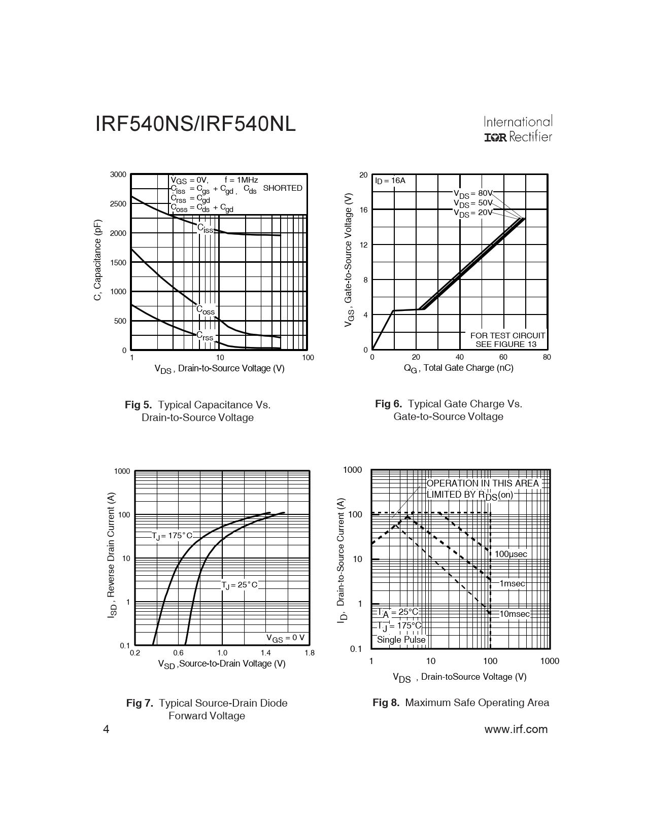 IRF540NS/IRF540NL 3000 20 VGS = 0V, f = 1MHz ID = 16A C = C + C C SHORTED iss gs gd , ds C = C V = 80V DS 2500 rss gd C = C + C V = 50V oss ds gd DS 16 V = 20V DS C 2000 iss 12 1500 8 1000 C, Capacitance (pF) Coss 4 500 GSV , Gate-to-Source Voltage (V) Crss FOR TEST CIRCUIT SEE FIGURE 13 0 0 1 10 100 0 20 40 60 80 V , Drain-to-Source Voltage (V) DS Q , Total Gate Charge (nC) G Fig 5. Typical Capacitance Vs. Fig 6. Typical Gate Charge Vs. Drain-to-Source Voltage Gate-to-Source Voltage 1000 1000 OPERATION IN THIS AREA ) LIMITED BY RDS(on) A( 100 t 100 nerr T = 175 C u J ° C ecr 100µsec 10 u 10 o S-ot T = 25 C - J ° n 1msec iar 1 D 1 I , Reverse Drain Current (A) SD , TA = 25°C 10msec I D TJ = 175°C V = 0 V GS Single Pulse 0.10.2 0.6 1.0 1.4 1.8 0.1 V ,Source-to-Drain Voltage (V) 1 10 100 1000 SD VDS , Drain-toSource Voltage (V) Fig 7. Typical Source-Drain Diode Fig 8. Maximum Safe Operating Area Forward Voltage 4 www.irf.com