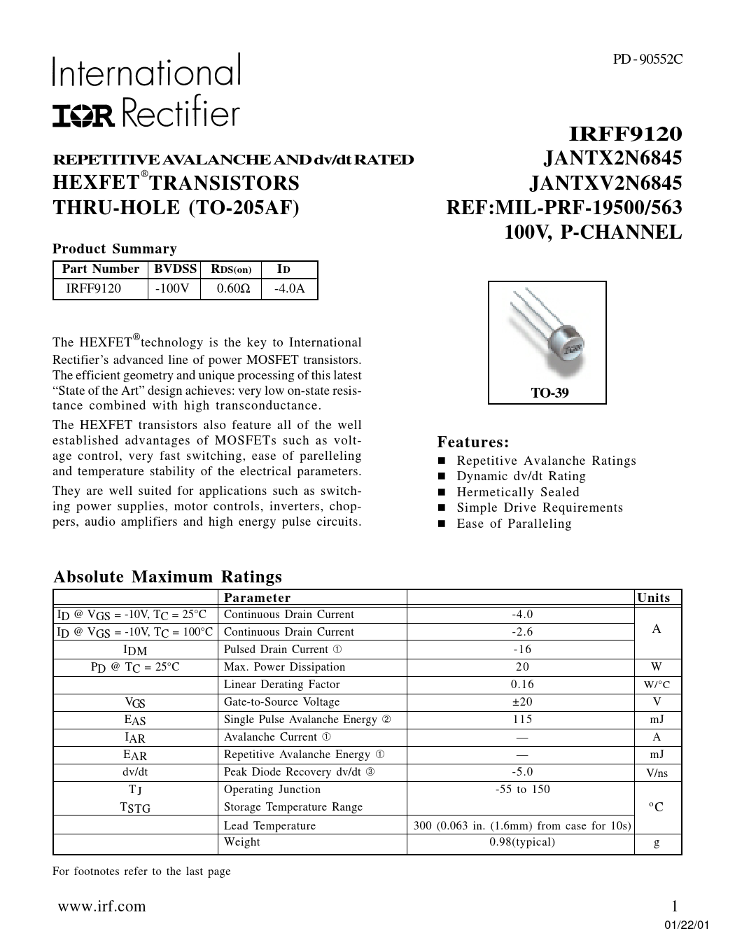 PD - 90552C IRFF9120REPETITIVE AVALANCHE AND dv/dt RATEDJANTX2N6845 HEXFET TRANSISTORSJANTXV2N6845THRU-HOLE (TO-205AF)REF:MIL-PRF-19500/563100V, P-CHANNELProduct SummaryPart Number BVDSS RDS(on)ID IRFF9120 -100V 0.60Ω -4.0A The HEXFET technology is the key to International Rectifier’s advanced line of power MOSFET transistors. The efficient geometry and unique processing of this latest “State of the Art” design achieves: very low on-state resis- TO-39 tance combined with high transconductance. The HEXFET transistors also feature all of the well established advantages of MOSFETs such as volt- Features: age control, very fast switching, ease of parelleling n Repetitive Avalanche Ratings and temperature stability of the electrical parameters. n Dynamic dv/dt Rating They are well suited for applications such as switch- n Hermetically Sealed ing power supplies, motor controls, inverters, chop- n Simple Drive Requirements pers, audio amplifiers and high energy pulse circuits. n Ease of Paralleling Absolute Maximum RatingsParameterUnits ID @ VGS = -10V, TC = 25°C Continuous Drain Current -4.0 ID @ VGS = -10V, TC = 100°C Continuous Drain Current -2.6 A IDM Pulsed Drain Current ➀ -16 PD @ TC = 25°C Max. Power Dissipation 2 0 W Linear Derating Factor 0.16 W/°C VGS Gate-to-Source Voltage ±20 V EAS Single Pulse Avalanche Energy ➁ 1 1 5 mJ IAR Avalanche Current ➀ — A EAR Repetitive Avalanche Energy ➀ — mJ dv/dt Peak Diode Recovery dv/dt ➂ -5.0 V/ns T J Operating Junction -55 to 150 T o STG Storage Temperature Range C Lead Temperature 300 (0.063 in. (1.6mm) from case for 10s) Weight 0.98(typical) g For footnotes refer to the last page www.irf.com 1 01/22/01