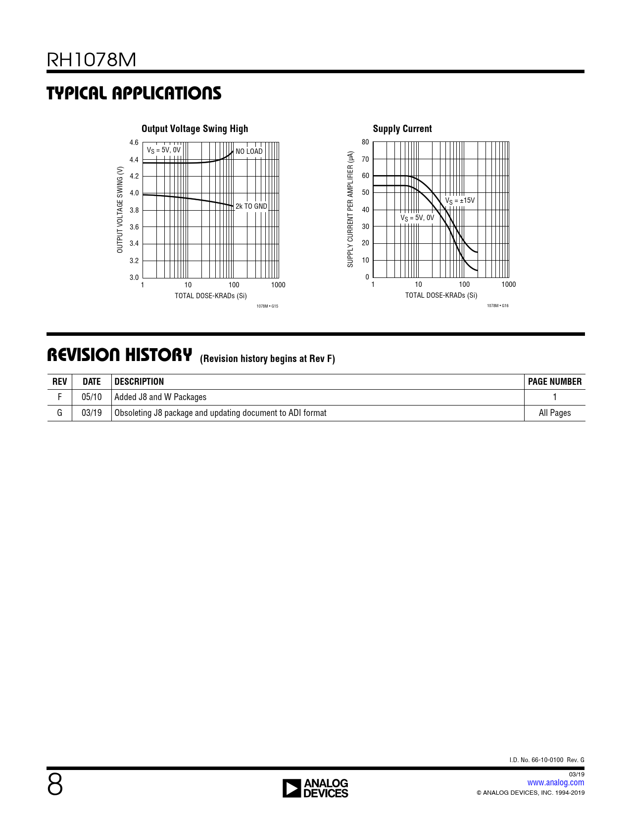 RH1078M TYPICAL APPLICATIONSOutput Voltage Swing HighSupply Current 4.6 80 VS = 5V, 0V NO LOAD 4.4 70 4.2 60 4.0 50 VS = ±15V 3.8 2k TO GND 40 VS = 5V, 0V 3.6 30 3.4 20 OUTPUT VOLTAGE SWING (V) 3.2 10 SUPPLY CURRENT PER AMPLIFIER (µA) 3.0 0 1 10 100 1000 1 10 100 1000 TOTAL DOSE-KRADs (Si) TOTAL DOSE-KRADs (Si) 1078M • G15 1078M • G16 REVISION HISTORY (Revision history begins at Rev F)REVDATEDESCRIPTIONPAGE NUMBER F 05/10 Added J8 and W Packages 1 G 03/19 Obsoleting J8 package and updating document to ADI format All Pages Rev. G I.D. No. 66-10-0100 Rev. G 8 03/19 www.analog.com ANALOG DEVICES, INC. 1994-2019 Document Outline Description Package/Order Information Burn-In Circuit Total Dose Bias Circuit Absolute Maximum Ratings Table 1: Electrical Characteristics Table 1A: Electrical Characteristics Table 2: Electrical Test Requirements Typical Applications Revision History