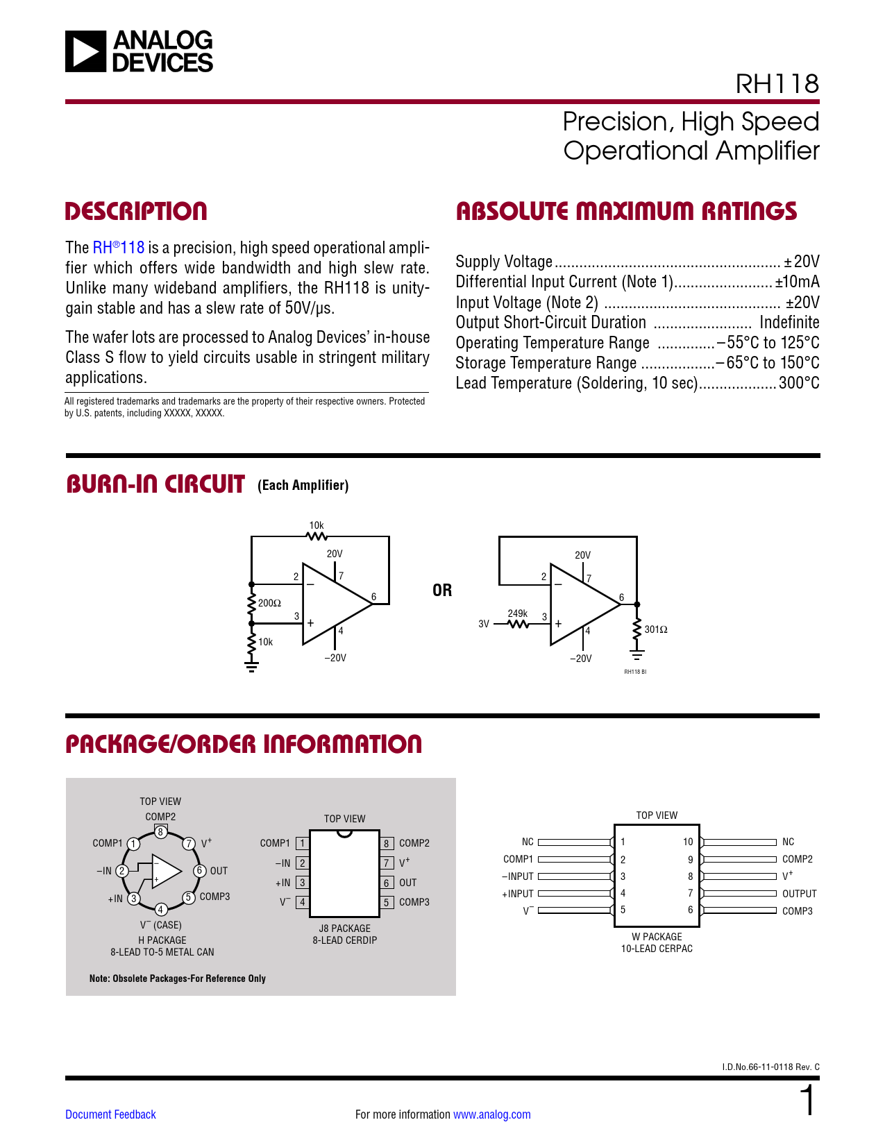 RH118 Precision, High Speed Operational Amplifier DESCRIPTIONABSOLUTE MAXIMUM RATINGS The RH®118 is a precision, high speed operational ampli- fier which offers wide bandwidth and high slew rate. Supply Voltage ... ±20V Unlike many wideband amplifiers, the RH118 is unity- Differential Input Current (Note 1) .. ±10mA gain stable and has a slew rate of 50V/µs. Input Voltage (Note 2) ... ±20V Output Short-Circuit Duration .. Indefinite The wafer lots are processed to Analog Devices’ in-house Operating Temperature Range ..–55°C to 125°C Class S flow to yield circuits usable in stringent military Storage Temperature Range ..–65°C to 150°C applications. Lead Temperature (Soldering, 10 sec) ...300°C All registered trademarks and trademarks are the property of their respective owners. Protected by U.S. patents, including XXXXX, XXXXX. BURN-IN CIRCUIT (Each Amplifier) 10k 20V 20V 2 – 7 2 – 7 OR 6 200Ω 6 3 + 249k 3 3V + 4 4 301Ω 10k –20V –20V RH118 BI PACKAGE/ORDER INFORMATION TOP VIEW COMP2 TOP VIEW TOP VIEW 8 COMP1 1 7 V+ COMP1 1 8 COMP2 NC 1 10 NC – –IN 2 7 V+ COMP1 2 9 COMP2 –IN 2 6 + OUT –INPUT 3 8 V+ +IN 3 6 OUT +IN 3 5 COMP3 +INPUT 4 7 OUTPUT V– 4 5 COMP3 4 V– 5 6 COMP3 V– (CASE) J8 PACKAGE H PACKAGE 8-LEAD CERDIP W PACKAGE 8-LEAD TO-5 METAL CAN 10-LEAD CERPAC Note: Obsolete Packages-For Reference Only I.D.No.66-11-0118 Rev. C Document Feedback For more information www.analog.com 1 Document Outline Description Burn-In Circuit Package/Order Information Absolute Maximum Ratings Table 1: Electrical Characteristics Table 1A: Electrical Characteristics Electrical Characteristics Total Dose Bias Circuit Table 2: Electrical Test Requirements Revision History