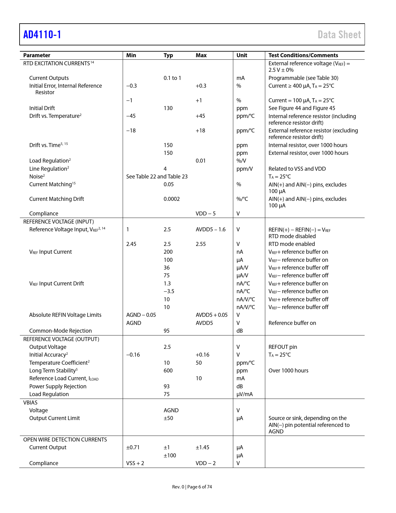 link to page 62 link to page 31 link to page 31 link to page 50 link to page 50 link to page 8 link to page 8 link to page 8 link to page 8 link to page 8 link to page 8 link to page 8 link to page 8 link to page 8 link to page 8 link to page 8 AD4110-1Data SheetParameterMinTypMaxUnitTest Conditions/Comments RTD EXCITATION CURRENTS14 External reference voltage (VREF) = 2.5 V ± 0% Current Outputs 0.1 to 1 mA Programmable (see Table 30) Initial Error, Internal Reference −0.3 +0.3 % Current ≥ 400 µA, TA = 25°C Resistor −1 +1 % Current = 100 µA, TA = 25°C Initial Drift 130 ppm See Figure 44 and Figure 45 Drift vs. Temperature2 −45 +45 ppm/°C Internal reference resistor (including reference resistor drift) −18 +18 ppm/°C External reference resistor (excluding reference resistor drift) Drift vs. Time5, 15 150 ppm Internal resistor, over 1000 hours 150 ppm External resistor, over 1000 hours Load Regulation2 0.01 %/V Line Regulation2 4 ppm/V Related to VSS and VDD Noise2 See Table 22 and Table 23 TA = 25°C Current Matching15 0.05 % AIN(+) and AIN(−) pins, excludes 100 µA Current Matching Drift 0.0002 %/°C AIN(+) and AIN(−) pins, excludes 100 µA Compliance VDD − 5 V REFERENCE VOLTAGE (INPUT) Reference Voltage Input, V 2, 14 REF 1 2.5 AVDD5 – 1.6 V REFIN(+) − REFIN(−) = VREF RTD mode disabled 2.45 2.5 2.55 V RTD mode enabled VREF Input Current 200 nA VREF+ reference buffer on 100 µA VREF− reference buffer on 36 µA/V VREF+ reference buffer off 75 µA/V VREF− reference buffer off VREF Input Current Drift 1.3 nA/°C VREF+ reference buffer on −3.5 nA/°C VREF− reference buffer on 10 nA/V/°C VREF+ reference buffer off 10 nA/V/°C VREF− reference buffer off Absolute REFIN Voltage Limits AGND − 0.05 AVDD5 + 0.05 V AGND AVDD5 V Reference buffer on Common-Mode Rejection 95 dB REFERENCE VOLTAGE (OUTPUT) Output Voltage 2.5 V REFOUT pin Initial Accuracy2 −0.16 +0.16 V TA = 25°C Temperature Coefficient2 10 50 ppm/°C Long Term Stability5 600 ppm Over 1000 hours Reference Load Current, ILOAD 10 mA Power Supply Rejection 93 dB Load Regulation 75 µV/mA VBIAS Voltage AGND V Output Current Limit ±50 µA Source or sink, depending on the AIN(−) pin potential referenced to AGND OPEN WIRE DETECTION CURRENTS Current Output ±0.71 ±1 ±1.45 µA ±100 µA Compliance VSS + 2 VDD − 2 V Rev. 0 | Page 6 of 74 Document Outline FEATURES APPLICATIONS GENERAL DESCRIPTION FUNCTIONAL BLOCK DIAGRAM TABLE OF CONTENTS REVISION HISTORY SPECIFICATIONS TIMING SPECIFICATIONS Timing Diagrams ABSOLUTE MAXIMUM RATINGS THERMAL RESISTANCE ESD CAUTION PIN CONFIGURATION AND FUNCTION DESCRIPTIONS TYPICAL PERFORMANCE CHARACTERISTICS THEORY OF OPERATION POWER SUPPLY SEQUENCE PROTECTION DIODE ANALOG INPUT PULL-UP/PULL-DOWN CURRENTS ANTIALIASING FILTER RTD EXCITATION CURRENTS FIELD POWER SUPPLY MODE NO POWER SUPPLY MODE BIAS VOLTAGE GENERATOR PGA CALIBRATION REGISTERS SERIAL INTERFACE CLOCK ADC ADC FILTER REGISTERS ADC GAIN AND OFFSET REGISTERS NOISE PERFORMANCE AND RESOLUTION MODES OF OPERATION DEFAULT MODE OF OPERATION ON POWER-UP CHANGING THE DEFAULT MODE OF OPERATION FOR FUTURE POWER-UP CYCLES POWER SUPPLY REQUIREMENTS SYSTEM CLOCK REQUIREMENTS BIPOLAR AND UNIPOLAR OUTPUT AUXILIARY LOW VOLTAGE INPUTS DIGITAL FILTER CONTINUOUS CONVERSION MODE INPUT AUTO SEQUENCING SINGLE CONVERSION MODE ADC CONVERSION DELAY BIAS VOLTAGE GENERATOR ANTIALIASING FILTER CIRCUIT CURRENT MODE Transimpedance Gain Using an External Sense Resistor VOLTAGE AND THERMOCOUPLE MODE Input Scaling for Voltage Mode Thermocouple Inputs RTD MODE Generating RTD Currents with an External Resistor Excitation Currents RTD Initial Drift 4-Wire RTD 3-Wire RTD 2-Wire RTD Alternative 3-Wire Configuration FIELD POWER SUPPLY MODE Overvoltage Protection NO POWER SUPPLY MODE Voltage Mode Current Mode System Redundancy GAIN CALIBRATION DATA REGISTER GAIN CALIBRATION IN VOLTAGE MODE GAIN CALIBRATION IN CURRENT MODE SCALING FACTOR AUTOCALIBRATION MODES APPLICATION EXAMPLES Example 1 Example 2 DIAGNOSTICS AND PROTECTION DIAGNOSTIC FLAGS ERROR PIN OVERTEMPERATURE DETECTION AND THERMAL SHUTDOWN OVERVOLTAGE AND UNDERVOLTAGE DETECTION OVERVOLTAGE PROTECTION DIAGNOSING OVERVOLTAGE AND UNDERVOLTAGE CONDITIONS OPEN WIRE DETECTION DIAGNOSTICS FOR RTD MEASUREMENTS AND RTD FLAGS NOISE, SETTLING TIME, AND DIGITAL FILTERING DIGITAL FILTER SINC5 + SINC1 FILTER SINC3 FILTER ENHANCED 50 HZ AND 60 HZ REJECTION FILTERS RTD MODE NOISE PERFORMANCE SERIAL PERIPHERAL INTERFACE RESETTING THE AD4110-1 SPI COMMAND TO COMMUNICATIONS REGISTER DOUT/ PIN WRITE OPERATION READ OPERATION MULTIPLE DEVICES ON THE SPI BUS CRC CHECKSUM CRC CHECKSUM METHODS Polynomial Calculation Polynomial CRC Calculation of a 24-Bit Word: 0x654321 (Eight Command Bits and 16-Bit Data) XOR Calculation REGISTER DETAILS AFE REGISTER MAP AFE REGISTER DESCRIPTIONS AFE_TOP_STATUS Register AFE_CNTRL1 Register AFE_CLK_CTRL Register AFE_CNTRL2 Register PGA_RTD_CTRL Register AFE_ERR_DISABLE Register AFE_DETAIL_STATUS Register AFE_CAL_DATA Register AFE_RSENSE_DATA Register NO_PWR_DEFAULT_SEL Register NO_PWR_DEFAULT_STATUS Register ADC REGISTER MAP ADC REGISTER DESCRIPTIONS ADC_STATUS Register ADC_MODE Register ADC_INTERFACE Register ADC_CONFIG Register Data Register Filter Register ADC_GPIO_CONFIG Register ID Register ADC_OFFSET0 Register ADC_OFFSET1 Register ADC_OFFSET2 Register ADC_OFFSET3 Register ADC_GAIN0 Register ADC_GAIN1 Register ADC_GAIN2 Register ADC_GAIN3 Register OUTLINE DIMENSIONS ORDERING GUIDE