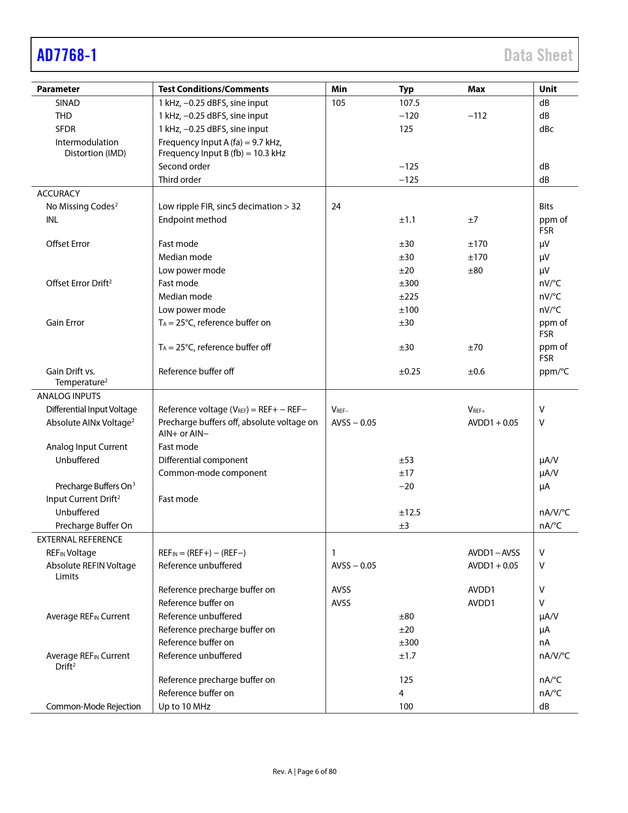 Páginas / Página80 / 6 — AD7768-1. Data Sheet. Parameter. Test Conditions/Comments. Min. Typ. Max. …