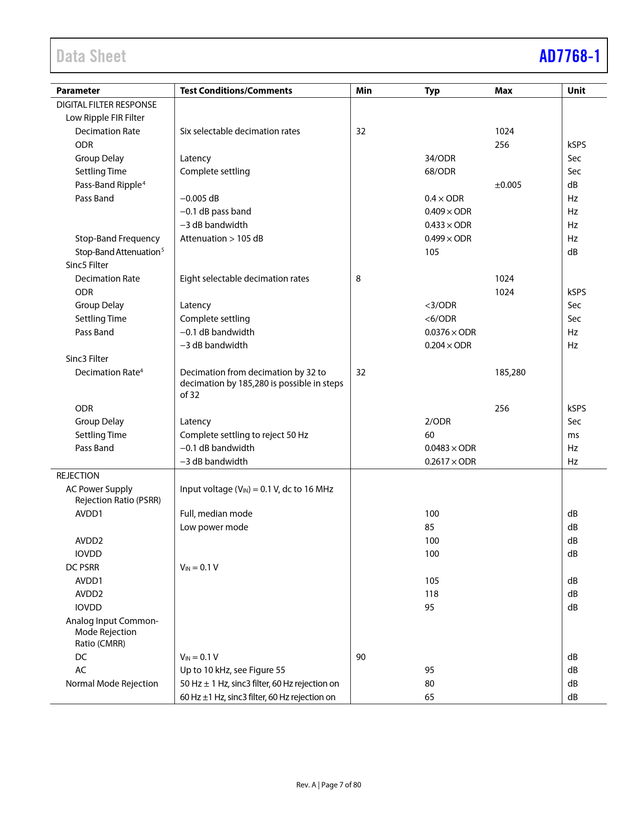 link to page 10 link to page 27 link to page 10 link to page 10 Data SheetAD7768-1ParameterTest Conditions/CommentsMinTypMaxUnit DIGITAL FILTER RESPONSE Low Ripple FIR Filter Decimation Rate Six selectable decimation rates 32 1024 ODR 256 kSPS Group Delay Latency 34/ODR Sec Settling Time Complete settling 68/ODR Sec Pass-Band Ripple4 ±0.005 dB Pass Band −0.005 dB 0.4 × ODR Hz −0.1 dB pass band 0.409 × ODR Hz −3 dB bandwidth 0.433 × ODR Hz Stop-Band Frequency Attenuation > 105 dB 0.499 × ODR Hz Stop-Band Attenuation5 105 dB Sinc5 Filter Decimation Rate Eight selectable decimation rates 8 1024 ODR 1024 kSPS Group Delay Latency <3/ODR Sec Settling Time Complete settling <6/ODR Sec Pass Band −0.1 dB bandwidth 0.0376 × ODR Hz −3 dB bandwidth 0.204 × ODR Hz Sinc3 Filter Decimation Rate4 Decimation from decimation by 32 to 32 185,280 decimation by 185,280 is possible in steps of 32 ODR 256 kSPS Group Delay Latency 2/ODR Sec Settling Time Complete settling to reject 50 Hz 60 ms Pass Band −0.1 dB bandwidth 0.0483 × ODR Hz −3 dB bandwidth 0.2617 × ODR Hz REJECTION AC Power Supply Input voltage (VIN) = 0.1 V, dc to 16 MHz Rejection Ratio (PSRR) AVDD1 Ful , median mode 100 dB Low power mode 85 dB AVDD2 100 dB IOVDD 100 dB DC PSRR VIN = 0.1 V AVDD1 105 dB AVDD2 118 dB IOVDD 95 dB Analog Input Common- Mode Rejection Ratio (CMRR) DC VIN = 0.1 V 90 dB AC Up to 10 kHz, see Figure 55 95 dB Normal Mode Rejection 50 Hz ± 1 Hz, sinc3 filter, 60 Hz rejection on 80 dB 60 Hz ±1 Hz, sinc3 filter, 60 Hz rejection on 65 dB Rev. A | Page 7 of 80 Document Outline FEATURES APPLICATIONS FUNCTIONAL BLOCK DIAGRAM TABLE OF CONTENTS REVISION HISTORY GENERAL DESCRIPTION SPECIFICATIONS 3 V OPERATION TIMING SPECIFICATIONS 1.8 V TIMING SPECIFICATIONS Timing Diagrams ABSOLUTE MAXIMUM RATINGS THERMAL RESISTANCE ESD CAUTION PIN CONFIGURATION AND FUNCTION DESCRIPTIONS TYPICAL PERFORMANCE CHARACTERISTICS TERMINOLOGY THEORY OF OPERATION CLOCKING, SAMPLING TREE, AND POWER SCALING Power vs. Noise Performance Optimization Example of Power vs. Noise Performance Optimization Configuration A Configuration B NOISE PERFORMANCE AND RESOLUTION CORE CONVERTER ADC Core and Signal Chain Analog Inputs and Precharge Buffering VCM Output Reference Input and Buffering CLOCKING AND CLOCK SELECTION CLKSEL Pin Using the Internal Oscillator DIGITAL FILTERING Sinc5 Filter Sinc3 Filter Programming for 50 Hz, 60 Hz, and 50 Hz and 60 Hz Rejection Low Ripple FIR Filter DECIMATION RATE CONTROL ANTIALIASING FILTERING Modulator Saturation Point Modulator Unprotected Zones Modulator Chopping Frequency GETTING STARTED Method of Configuration—PINB Control Mode or SPI Control Mode Digital Filter Type and Decimation Power Mode POWER SUPPLIES Single-Supply Mode Recommended Power Supply Configuration DEVICE CONFIGURATION METHOD PINB Configuration SPI Control PIN CONTROL MODE OVERVIEW Power Mode Data Output Format Diagnostics and Status Bits Daisy-Chaining—PINB Control Mode Only SPI CONTROL OVERVIEW SPI CONTROL MODE MCLK Source and MCLK Division Power-Down Mode Standby Mode SPI Synchronization Offset Calibration Gain Calibration Reset over SPI Control Interface Resume from Shutdown GPIO and STARTB Functions SPI Mode Diagnostic Features Reference Detection Clock Qualification CRC on SPI Transaction Flags for Detection of Illegal Register Write CRC Checks POR Monitor MCLK Counter Product Identification (ID) Number DIGITAL INTERFACE SPI Reading and Writing SPI Control Interface Error Handling CRC Check on Serial Interface Conversion Read Modes Single-Conversion Read Mode Continuous Read Mode Exiting Continuous Read Mode DATA CONVERSION MODES Continuous Conversion Mode One Shot Conversion Mode Single-Conversion Mode Duty Cycled Conversion Mode SYNCHRONIZATION OF MULTIPLE AD7768-1 DEVICES ADDITIONAL FUNCTIONALITY OF THE AD7768-1 Reset Status Header Diagnostics APPLICATIONS INFORMATION ANALOG INPUT RECOMMENDATIONS Recommended Driver Amplifiers ANTIALIASING FILTER DESIGN CONSIDERATIONS RECOMMENDED INTERFACE Initializing the Recommended Interface Recommended Interface for Reading Data Resynchronization of the Recommended Interface PROGRAMMABLE DIGITAL FILTER Filter Coefficients Upload Sequence Example Filter Upload Filter Upload Verification ELECTROMAGNETIC COMPATIBILITY (EMC) TESTING Radiated Immunity Radiated Emissions Electrical Fast Transients (EFTs) AD7768-1 SUBSYSTEM LAYOUT REGISTER SUMMARY REGISTER DETAILS COMPONENT TYPE REGISTER UNIQUE PRODUCT ID REGISTERS DEVICE GRADE AND REVISION REGISTER USER SCRATCHPAD REGISTER DEVICE VENDOR ID REGISTERS INTERFACE FORMAT CONTROL REGISTER POWER AND CLOCK CONTROL REGISTER ANALOG BUFFER CONTROL REGISTER VCM CONTROL REGISTER CONVERSION SOURCE SELECT AND MODE CONTROL REGISTER DIGITAL FILTER AND DECIMATION CONTROL REGISTER SINC3 DECIMATION RATE (MSB REGISTER) SINC3 DECIMATION RATE (LSB REGISTER) PERIODIC CONVERSION RATE CONTROL REGISTER SYNCHRONIZATION MODES AND RESET TRIGGERING REGISTER GPIO PORT CONTROL REGISTER GPIO OUTPUT CONTROL REGISTER GPIO INPUT READ REGISTER OFFSET CALIBRATION MSB REGISTER OFFSET CALIBRATION MID REGISTER OFFSET CALIBRATION LSB REGISTER GAIN CALIBRATION MSB REGISTER GAIN CALIBRATION MID REGISTER GAIN CALIBRATION LSB REGISTER SPI INTERFACE DIAGNOSTIC CONTROL REGISTER ADC DIAGNOSTIC FEATURE CONTROL REGISTER DIGITAL DIAGNOSTIC FEATURE CONTROL REGISTER CONVERSION RESULT REGISTER DEVICE ERROR FLAGS MASTER REGISTER SPI INTERFACE ERROR REGISTER ADC DIAGNOSTICS OUTPUT REGISTER DIGITAL DIAGNOSTICS OUTPUT REGISTER MCLK DIAGNOSTIC OUTPUT REGISTER COEFFICIENT CONTROL REGISTER COEFFICIENT DATA REGISTER ACCESS KEY REGISTER OUTLINE DIMENSIONS ORDERING GUIDE