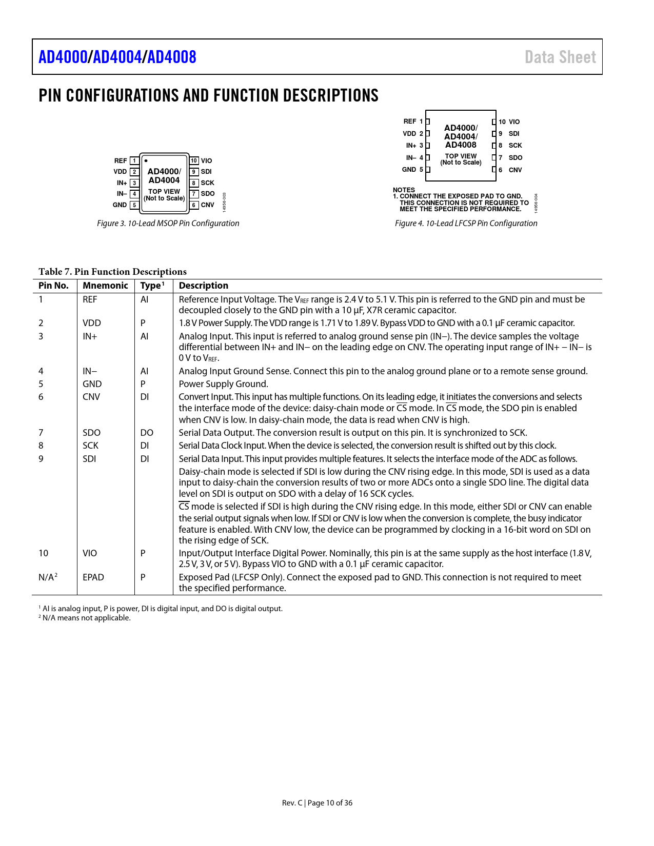 AD4000/AD4004/AD4008Data SheetPIN CONFIGURATIONS AND FUNCTION DESCRIPTIONSREF 110 VIOAD4000/VDD 29SDIAD4004/IN+ 3AD40088SCKIN– 4TOP VIEW7SDOREF110 VIO(Not to Scale)VDD2AD4000/9SDIGND 56CNVIN+AD400438SCKNOTESIN–4TOP VIEW7SDO 003 (Not to Scale)1. CONNECT THE EXPOSED PAD TO GND. 004 GNDTHIS CONNECTION IS NOT REQUIRED TO56CNVMEET THE SPECIFIED PERFORMANCE. 14956- 14956- Figure 3. 10-Lead MSOP Pin Configuration Figure 4. 10-Lead LFCSP Pin Configuration Table 7. Pin Function Descriptions Pin No.Mnemonic Type1Description 1 REF AI Reference Input Voltage. The VREF range is 2.4 V to 5.1 V. This pin is referred to the GND pin and must be decoupled closely to the GND pin with a 10 µF, X7R ceramic capacitor. 2 VDD P 1.8 V Power Supply. The VDD range is 1.71 V to 1.89 V. Bypass VDD to GND with a 0.1 μF ceramic capacitor. 3 IN+ AI Analog Input. This input is referred to analog ground sense pin (IN−). The device samples the voltage differential between IN+ and IN− on the leading edge on CNV. The operating input range of IN+ − IN− is 0 V to VREF. 4 IN− AI Analog Input Ground Sense. Connect this pin to the analog ground plane or to a remote sense ground. 5 GND P Power Supply Ground. 6 CNV DI Convert Input. This input has multiple functions. On its leading edge, it initiates the conversions and selects the interface mode of the device: daisy-chain mode or CS mode. In CS mode, the SDO pin is enabled when CNV is low. In daisy-chain mode, the data is read when CNV is high. 7 SDO DO Serial Data Output. The conversion result is output on this pin. It is synchronized to SCK. 8 SCK DI Serial Data Clock Input. When the device is selected, the conversion result is shifted out by this clock. 9 SDI DI Serial Data Input. This input provides multiple features. It selects the interface mode of the ADC as follows. Daisy-chain mode is selected if SDI is low during the CNV rising edge. In this mode, SDI is used as a data input to daisy-chain the conversion results of two or more ADCs onto a single SDO line. The digital data level on SDI is output on SDO with a delay of 16 SCK cycles. CS mode is selected if SDI is high during the CNV rising edge. In this mode, either SDI or CNV can enable the serial output signals when low. If SDI or CNV is low when the conversion is complete, the busy indicator feature is enabled. With CNV low, the device can be programmed by clocking in a 16-bit word on SDI on the rising edge of SCK. 10 VIO P Input/Output Interface Digital Power. Nominally, this pin is at the same supply as the host interface (1.8 V, 2.5 V, 3 V, or 5 V). Bypass VIO to GND with a 0.1 μF ceramic capacitor. N/A2 EPAD P Exposed Pad (LFCSP Only). Connect the exposed pad to GND. This connection is not required to meet the specified performance. 1 AI is analog input, P is power, DI is digital input, and DO is digital output. 2 N/A means not applicable. Rev. C | Page 10 of 36 Document Outline FEATURES APPLICATIONS GENERAL DESCRIPTION FUNCTIONAL BLOCK DIAGRAM TABLE OF CONTENTS REVISION HISTORY SPECIFICATIONS TIMING SPECIFICATIONS ABSOLUTE MAXIMUM RATINGS THERMAL RESISTANCE ESD CAUTION PIN CONFIGURATIONS AND FUNCTION DESCRIPTIONS TYPICAL PERFORMANCE CHARACTERISTICS TERMINOLOGY THEORY OF OPERATION CIRCUIT INFORMATION CONVERTER OPERATION TRANSFER FUNCTIONS APPLICATIONS INFORMATION TYPICAL APPLICATION DIAGRAMS ANALOG INPUTS Input Overvoltage Clamp Circuit Switched Capacitor Input RC Filter Values DRIVER AMPLIFIER CHOICE High Frequency Input Signals Multiplexed Applications EASE OF DRIVE FEATURES Input Span Compression High-Z Mode Long Acquisition Phase VOLTAGE REFERENCE INPUT POWER SUPPLY DIGITAL INTERFACE REGISTER READ/WRITE FUNCTIONALITY STATUS WORD CSB MODE, 3-WIRE TURBO MODE CSB MODE, 3-WIRE WITHOUT BUSY INDICATOR CSB MODE, 3-WIRE WITH BUSY INDICATOR CSB MODE, 4-WIRE TURBO MODE CSB MODE, 4-WIRE WITHOUT BUSY INDICATOR CSB MODE, 4-WIRE WITH BUSY INDICATOR DAISY-CHAIN MODE LAYOUT GUIDELINES EVALUATING THE AD4000/AD4004/AD4008 PERFORMANCE OUTLINE DIMENSIONS ORDERING GUIDE