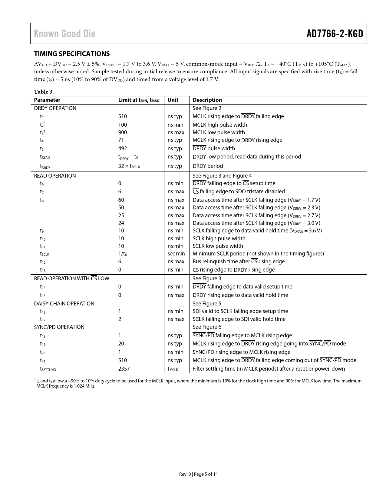 link to page 6 link to page 6 link to page 6 link to page 6 link to page 7 link to page 7 Known Good DieAD7766-2-KGDTIMING SPECIFICATIONS AVDD = DVDD = 2.5 V ± 5%, VDRIVE = 1.7 V to 3.6 V, VREF+ = 5 V, common-mode input = VREF+/2, TA = −40°C (TMIN) to +105°C (TMAX), unless otherwise noted. Sample tested during initial release to ensure compliance. All input signals are specified with rise time (tR) = fall time (tF) = 5 ns (10% to 90% of DVDD) and timed from a voltage level of 1.7 V. Table 3. ParameterLimit at tMIN, tMAXUnitDescription DRDY OPERATION See Figure 2 t1 510 ns typ MCLK rising edge to DRDY falling edge t 1 2 100 ns min MCLK high pulse width t 1 3 900 ns max MCLK low pulse width t4 71 ns typ MCLK rising edge to DRDY rising edge t5 492 ns typ DRDY pulse width tREAD t − t DRDY 5 ns typ DRDY low period, read data during this period t 32 × t DRDY MCLK ns typ DRDY period READ OPERATION See Figure 3 and Figure 4 t6 0 ns min DRDY falling edge to CS setup time t7 6 ns max CS falling edge to SDO tristate disabled t8 60 ns max Data access time after SCLK falling edge (VDRIVE = 1.7 V) 50 ns max Data access time after SCLK falling edge (VDRIVE = 2.3 V) 25 ns max Data access time after SCLK falling edge (VDRIVE = 2.7 V) 24 ns max Data access time after SCLK falling edge (VDRIVE = 3.0 V) t9 10 ns min SCLK falling edge to data valid hold time (VDRIVE = 3.6 V) t10 10 ns min SCLK high pulse width t11 10 ns min SCLK low pulse width tSCLK 1/t8 sec min Minimum SCLK period (not shown in the timing figures) t12 6 ns max Bus relinquish time after CS rising edge t13 0 ns min CS rising edge to DRDY rising edge READ OPERATION WITH CS LOW See Figure 3 t14 0 ns min DRDY falling edge to data valid setup time t15 0 ns max DRDY rising edge to data valid hold time DAISY-CHAIN OPERATION See Figure 5 t16 1 ns min SDI valid to SCLK falling edge setup time t17 2 ns max SCLK falling edge to SDI valid hold time SYNC/PD OPERATION See Figure 6 t18 1 ns typ SYNC/PD falling edge to MCLK rising edge t19 20 ns typ MCLK rising edge to DRDY rising edge going into SYNC/PD mode t20 1 ns min SYNC/PD rising edge to MCLK rising edge t21 510 ns typ MCLK rising edge to DRDY falling edge coming out of SYNC/PD mode tSETTLING 2357 tMCLK Filter settling time (in MCLK periods) after a reset or power-down 1 t2 and t3 allow a ~90% to 10% duty cycle to be used for the MCLK input, where the minimum is 10% for the clock high time and 90% for MCLK low time. The maximum MCLK frequency is 1.024 MHz. Rev. 0 | Page 5 of 11 Document Outline FEATURES APPLICATIONS GENERAL DESCRIPTION FUNCTIONAL BLOCK DIAGRAM RELATED DEVICES TABLE OF CONTENTS REVISION HISTORY SPECIFICATIONS TIMING SPECIFICATIONS Timing Diagrams ABSOLUTE MAXIMUM RATINGS ESD CAUTION PIN CONFIGURATION AND FUNCTION DESCRIPTIONS OUTLINE DIMENSIONS DIE SPECIFICATIONS AND ASSEMBLY RECOMMENDATIONS ORDERING GUIDE