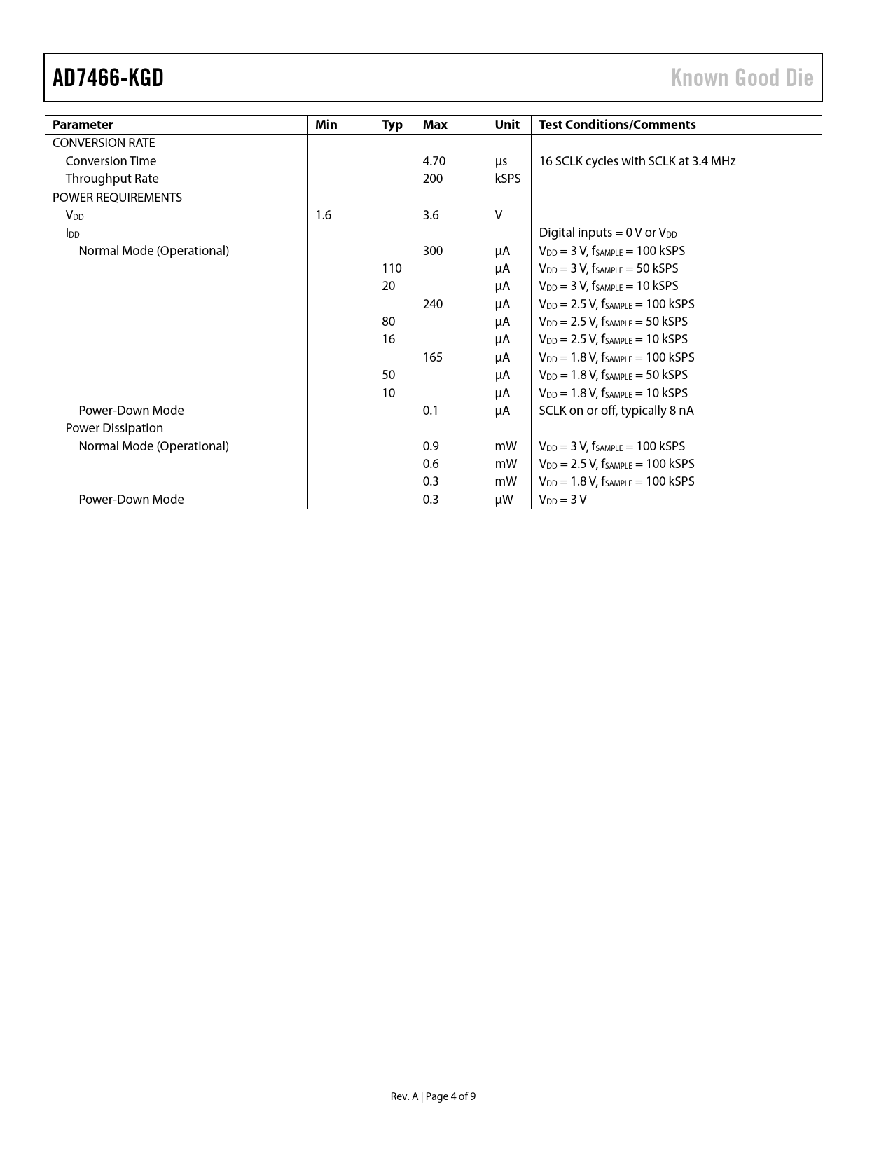 | Páginas / Página | 9 / 4 — AD7466-KGD. Known Good Die. Parameter. Min. Typ. Max. Unit. Test … |