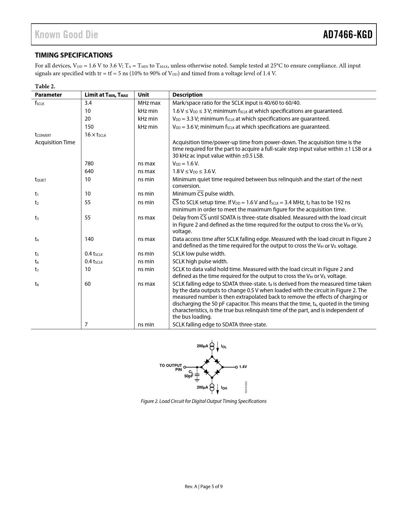 Known Good Die AD7466-KGD TIMING SPECIFICATIONS Table 2 Parameter Limit at TMIN, TMAX Unit Description 200µA IOL TO OUTPUT 1.4V