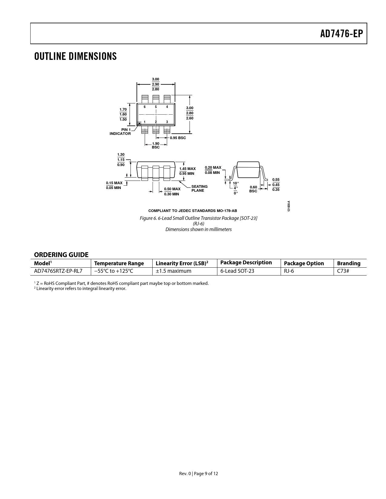 AD7476-EP OUTLINE DIMENSIONS 3.00 2.90 2.80 6 5 4 3.00 1.70 2.80 1.60 2.60 1.50 1 2 3 PIN 1 INDICATOR 0.95 BSC 1.90 BSC 1.30 1.15 0.90 1.45 MAX 0.20 MAX 0.95 MIN 0.08 MIN 0.55 0.15 MAX 10° 0.45 SEATING 0.05 MIN 0.60 0.50 MAX PLANE BSC 0.35 0.30 MIN -A 08 16 COMPLIANT TO JEDEC STANDARDS MO-178-AB 12