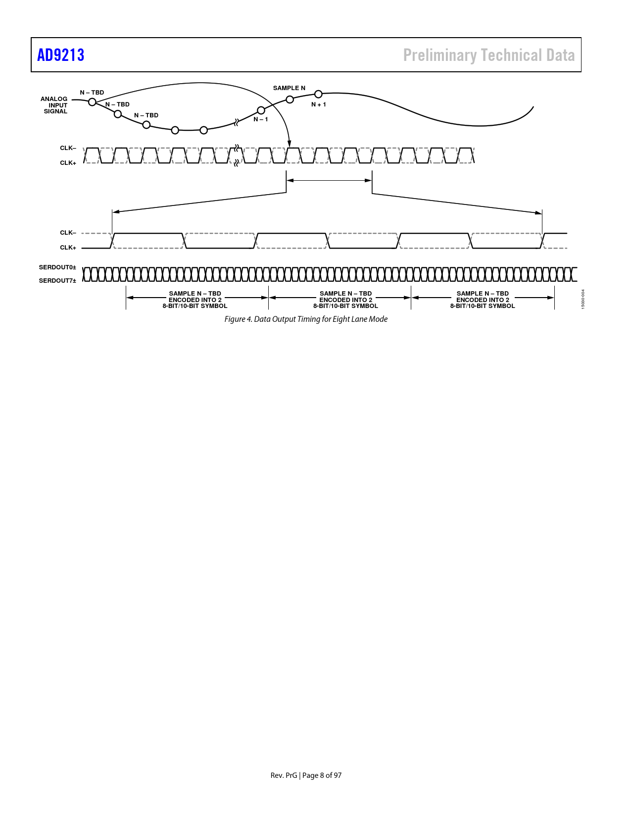 AD9213. Preliminary Technical Data. SAMPLE N. N – TBD. ANALOG. INPUT. N + 1. SIGNAL. N – 1. CLK–. CLK+. SERDOUT0±. SERDOUT7±. SAMPLE N – TBD