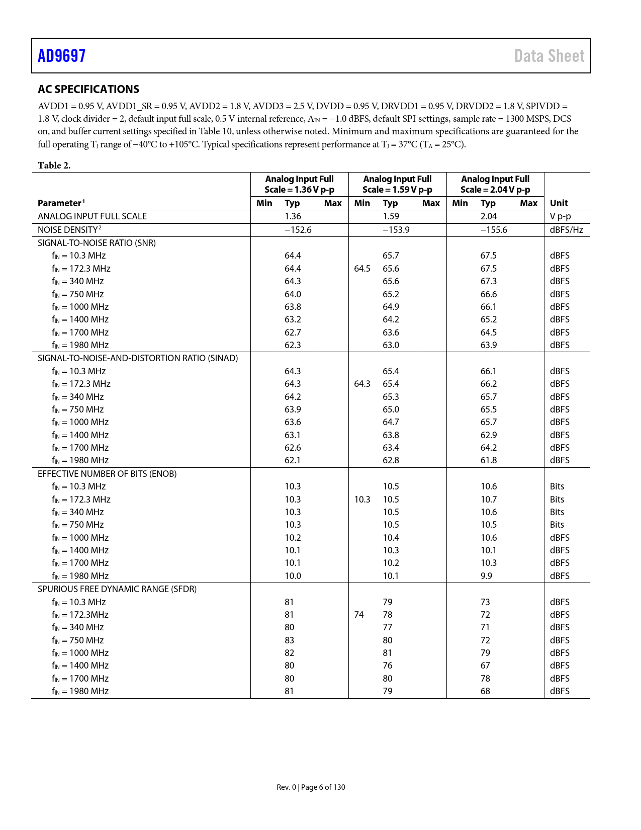 | Páginas / Página | 130 / 6 — AD9697. Data Sheet. AC SPECIFICATIONS. Table 2. Analog Input Full. Scale … |
