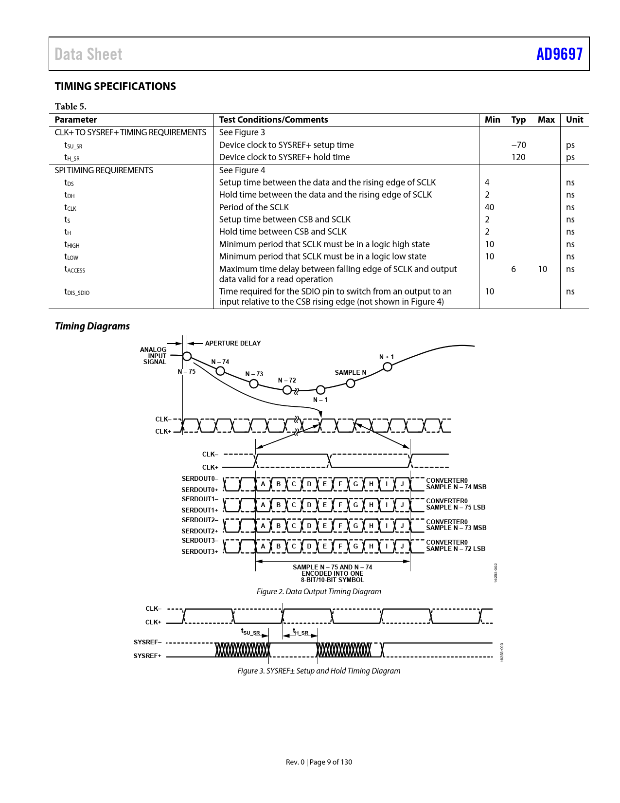 link to page 9 link to page 10 link to page 10 Data SheetAD9697TIMING SPECIFICATIONSTable 5. ParameterTest Conditions/CommentsMinTypMaxUnit CLK+ TO SYSREF+ TIMING REQUIREMENTS See Figure 3 tSU_SR Device clock to SYSREF+ setup time −70 ps tH_SR Device clock to SYSREF+ hold time 120 ps SPI TIMING REQUIREMENTS See Figure 4 tDS Setup time between the data and the rising edge of SCLK 4 ns tDH Hold time between the data and the rising edge of SCLK 2 ns tCLK Period of the SCLK 40 ns tS Setup time between CSB and SCLK 2 ns tH Hold time between CSB and SCLK 2 ns tHIGH Minimum period that SCLK must be in a logic high state 10 ns tLOW Minimum period that SCLK must be in a logic low state 10 ns tACCESS Maximum time delay between falling edge of SCLK and output 6 10 ns data valid for a read operation tDIS_SDIO Time required for the SDIO pin to switch from an output to an 10 ns input relative to the CSB rising edge (not shown in Figure 4) Timing DiagramsAPERTURE DELAYANALOGINPUTN + 1SIGNALN – 74N – 75N – 73SAMPLE NN – 72N – 1CLK–CLK+CLK–CLK+SERDOUT0–CONVERTER0ABCDEFGHIJSAMPLE N – 74 MSBSERDOUT0+ SERDOUT1–CONVERTER0ABCDEFGHIJSAMPLE N – 75 LSBSERDOUT1+ SERDOUT2–CONVERTER0ABCDEFGHIJSAMPLE N – 73 MSBSERDOUT2+ SERDOUT3–CONVERTER0ABCDEFGHIJSAMPLE N – 72 LSBSERDOUT3+SAMPLE N – 75 AND N – 74 002 ENCODED INTO ONE8-BIT/10-BIT SYMBOL 16253- Figure 2. Data Output Timing Diagram CLK–CLK+tSU_SRtH_SRSYSREF– 3 0 -0 SYSREF+ 253 16 Figure 3. SYSREF± Setup and Hold Timing Diagram Rev. 0 | Page 9 of 130 Document Outline FEATURES APPLICATIONS FUNCTIONAL BLOCK DIAGRAM TABLE OF CONTENTS REVISION HISTORY GENERAL DESCRIPTION PRODUCT HIGHLIGHTS SPECIFICATIONS DC SPECIFICATIONS AC SPECIFICATIONS DIGITAL SPECIFICATIONS SWITCHING SPECIFICATIONS TIMING SPECIFICATIONS Timing Diagrams ABSOLUTE MAXIMUM RATINGS THERMAL CHARACTERISTICS ESD CAUTION PIN CONFIGURATION AND FUNCTION DESCRIPTIONS TYPICAL PERFORMANCE CHARACTERISTICS EQUIVALENT CIRCUITS THEORY OF OPERATION ADC ARCHITECTURE ANALOG INPUT CONSIDERATIONS Differential Input Configurations Input Common Mode Analog Input Buffer Controls and SFDR Optimization Absolute Maximum Input Swing Dither VOLTAGE REFERENCE DC OFFSET CALIBRATION CLOCK INPUT CONSIDERATIONS Clock Duty Cycle Considerations Input Clock Divider Input Clock Divider ½ Period Delay Adjust Clock Fine Delay and Superfine Delay Adjust Clock Coupling Considerations Clock Jitter Considerations POWER-DOWN/STANDBY MODE TEMPERATURE DIODE ADC OVERRANGE AND FAST DETECT ADC OVERRANGE FAST THRESHOLD DETECTION (FD) ADC APPLICATION MODES AND JESD204B Tx CONVERTER MAPPING PROGRAMMABLE FINITE IMPULSE RESPONSE (FIR) FILTERS SUPPORTED MODES PROGRAMMING INSTRUCTIONS DIGITAL DOWNCONVERTER (DDC) DDC I/Q OUTPUT SELECTION DDC GENERAL DESCRIPTION Frequency Translation Stage (Optional) Filtering Stage Gain Stage (Optional) Complex to Real Conversion Stage (Optional) DDC FREQUENCY TRANSLATION DDC Frequency Translation General Description Variable IF Mode 0 Hz IF (ZIF) Mode fS/4 Hz IF Mode Test Mode DDC NCO Description DDC NCO Programmable Modulus Mode DDC NCO Coherent Mode NCO FTW/POW/MAW/MAB Description NCO FTW/POW/MAW/MAB Programmable Modulus Mode NCO FTW/POW/MAW/MAB Coherent Mode NCO Channel Selection GPIO Level Control Mode GPIO Edge Control Mode Register Map Mode Setting Up the Multichannel NCO Feature NCO Synchronization NCO Multichip Synchronization NCO Multichip Synchronization at Startup NCO Multichip Synchronization During Normal Operation DDC Mixer Description DDC NCO + Mixer Loss and SFDR DDC DECIMATION FILTERS HB4 Filter Description HB3 Filter Description HB2 Filter Description HB1 Filter Description TB2 Filter Description TB1 Filter Description FB2 Filter Description DDC GAIN STAGE DDC COMPLEX TO REAL CONVERSION DDC MIXED DECIMATION SETTINGS DDC EXAMPLE CONFIGURATIONS SIGNAL MONITOR SPORT OVER JESD204B DIGITAL OUTPUTS INTRODUCTION TO THE JESD204B INTERFACE JESD204B OVERVIEW FUNCTIONAL OVERVIEW Transport Layer Data Link Layer Physical Layer JESD204B LINK ESTABLISHMENT Code Group Synchronization (CGS) Initial Lane Alignment Sequence (ILAS) User Data and Error Detection 8-Bit/10-Bit Encoder PHYSICAL LAYER (DRIVER) OUTPUTS Digital Outputs, Timing, and Controls De-Emphasis Phase-Locked Loop (PLL) SETTING UP THE AD9697 DIGITAL INTERFACE Example Setup 1—Full Bandwidth Mode Example Setup 2—ADC with DDC Option (Two ADCs Plus Two DDCs) DETERMINISTIC LATENCY SUBCLASS 0 OPERATION SUBCLASS 1 OPERATION Deterministic Latency Requirements Setting Deterministic Latency Registers MULTICHIP SYNCHRONIZATION NORMAL MODE TIMESTAMP MODE SYSREF± INPUT SYREF± Control Features SYSREF± SETUP/HOLD WINDOW MONITOR LATENCY END TO END TOTAL LATENCY EXAMPLE LATENCY CALCULATIONS LMFC REFERENCED LATENCY TEST MODES ADC TEST MODES JESD204B BLOCK TEST MODES Transport Layer Sample Test Mode Interface Test Modes Data Link Layer Test Modes SERIAL PORT INTERFACE (SPI) CONFIGURATION USING THE SPI HARDWARE INTERFACE SPI ACCESSIBLE FEATURES MEMORY MAP READING THE MEMORY MAP REGISTER TABLE Open and Reserved Locations Default Values Logic Levels SPI Soft Reset MEMORY MAP REGISTERS APPLICATIONS INFORMATION POWER SUPPLY RECOMMENDATIONS LAYOUT GUIDELINES AVDD1_SR (PIN 57) AND AGND_SR (PIN 56 AND PIN 60) OUTLINE DIMENSIONS ORDERING GUIDE
