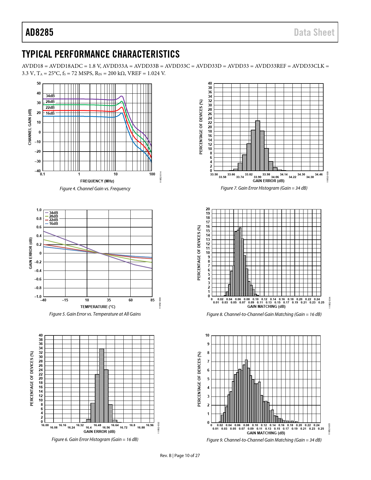 Línea de modelo para esta hoja de datos Versión de texto del documento AD8285 Data Sheet TYPICAL PERFORMANCE CHARACTERISTICS AVDD18 = AVDD18ADC = 1.8 V, AVDD33A = AVDD33B = AVDD33C = AVDD33D = AVDD33 = AVDD33REF = AVDD33CLK = 3.3 V, TA = 25°C, fS = 72 MSPS, RIN = 200 kΩ, VREF = 1.024 V.50 40 38 40 36 34dB 34 ) 32 30 28dB 30 22dB B) ES (% 28 20 C (d 16dB 26 N EVI 24 AI 10 D F 22 G L 20 0 E O G 18 NNE 16 TA –10 N 14 CHA E C 12 10 –20 PER 8 6 –30 4 2 –40 0 0.1 1 10 100 33.50 33.66 33.82 33.98 34.14 34.30 34.46 33 -014 033.58 33.74 33.90 34.06 34.22 34.38 52-FREQUENCY (MHz) 952 1GAIN ERROR (dB) 19 1 1 Figure 4. Channel Gain vs. Frequency Figure 7. Gain Error Histogram (Gain = 34 dB)1.0 20 34dB 19 28dB 0.8 18 22dB 16dB 17 ) 0.6 16 (% 15 0.4 ES 14 B) C 13 d 0.2 EVI 12 R ( D F 11 0 10 RRO O E 9 G N E –0.2 A 8 AI T 7 G –0.4 EN C 6 R 5 E –0.6 P 4 3 –0.8 2 1 –1.0 0 –40 –15 10 35 60 85 380 0.02 0.04 0.06 0.08 0.10 0.12 0.14 0.16 0.18 0.20 0.22 0.24 34 0 0 2-0.01 0.03 0.05 0.07 0.09 0.11 0.13 0.15 0.17 0.19 0.21 0.23 0.25 52-TEMPERATURE (°C) 95 1GAIN MATCHING (dB) 1 119 Figure 5. Gain Error vs. Temperature at All Gains Figure 8. Channel-to-Channel Gain Matching (Gain = 16 dB)40 10 38 36 9 34 ) ) % 32 8 ( 30 S 28 ES (% 7 ICE C V 26 24 EVI 6 DE F 22 D F O 20 O 5 E 18 E G AG 16 4 TA NT 14 N E CE 12 C 3 R 10 E P 8 PER 2 6 4 1 2 0 20 16.00 16.16 16.32 16.48 16.64 16.8 16.96 5 030 0.02 0.04 0.06 0.08 0.10 0.12 0.14 0.16 0.18 0.20 0.22 0.24 16.08 16.24 16.4 16.56 16.72 16.88 2- 030.01 0.03 0.05 0.07 0.09 0.11 0.13 0.15 0.17 0.19 0.21 0.23 0.25 2-GAIN ERROR (dB) 95 11GAIN MATCHING (dB) 195 1 Figure 6. Gain Error Histogram (Gain = 16 dB) Figure 9. Channel-to-Channel Gain Matching (Gain = 34 dB) Rev. B | Page 10 of 27 Document Outline FEATURES APPLICATIONS FUNCTIONAL BLOCK DIAGRAM GENERAL DESCRIPTION TABLE OF CONTENTS REVISION HISTORY SPECIFICATIONS AC SPECIFICATIONS DIGITAL SPECIFICATIONS SWITCHING SPECIFICATIONS ABSOLUTE MAXIMUM RATINGS ESD CAUTION PIN CONFIGURATION AND FUNCTION DESCRIPTIONS TYPICAL PERFORMANCE CHARACTERISTICS THEORY OF OPERATION RADAR RECEIVE PATH AFE CHANNEL OVERVIEW Low Noise Amplifier (LNA) Recommendation Antialiasing Filter (AAF) Mux and Mux Controller ADC CLOCK INPUT CONSIDERATIONS CLOCK DUTY CYCLE CONSIDERATIONS CLOCK JITTER CONSIDERATIONS SDIO PIN SCLK PIN CS\ PIN RBIAS PIN VOLTAGE REFERENCE POWER AND GROUND RECOMMENDATIONS EXPOSED PADDLE THERMAL HEAT SLUG RECOMMENDATIONS SERIAL PERIPHERAL INTERFACE (SPI) HARDWARE INTERFACE MEMORY MAP READING THE MEMORY MAP TABLE LOGIC LEVELS RESERVED LOCATIONS DEFAULT VALUES APPLICATION DIAGRAMS OUTLINE DIMENSIONS ORDERING GUIDE AUTOMOTIVE PRODUCTS