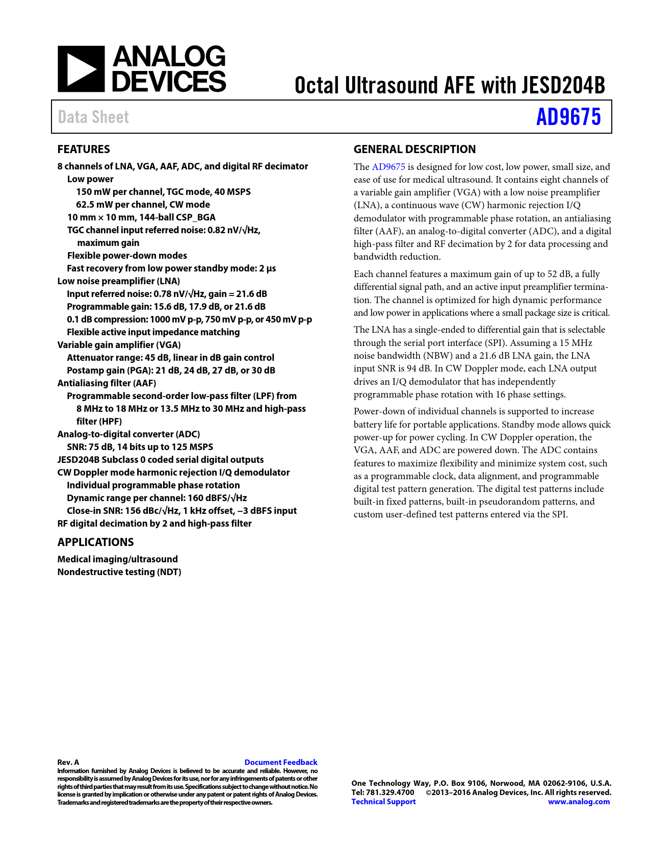 Octal Ultrasound AFE with JESD204B. Data Sheet. AD9675. FEATURES. GENERAL DESCRIPTION