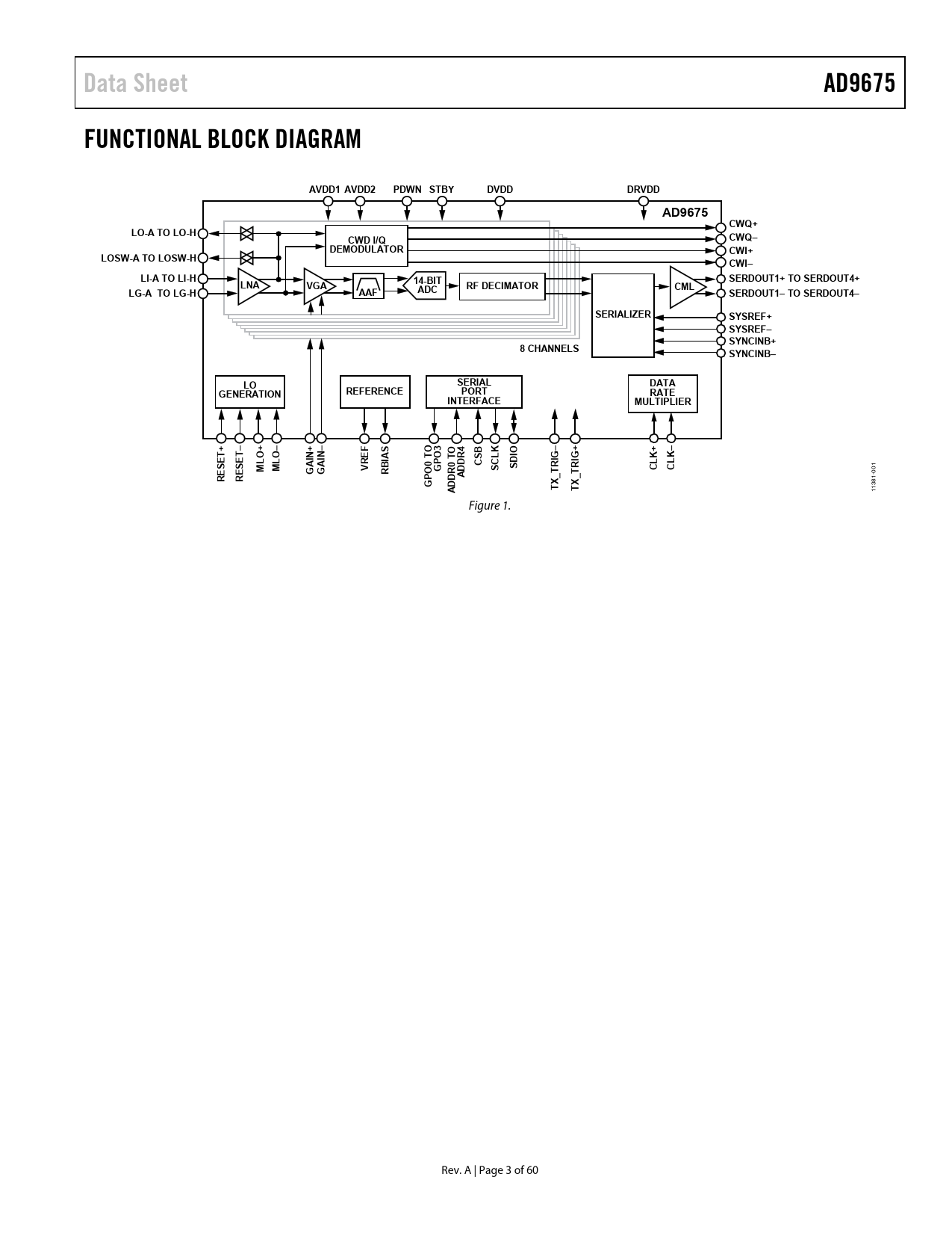 Data Sheet AD9675 FUNCTIONAL BLOCK DIAGRAM AVDD1 AVDD2 PDWN STBY DVDD DRVDD AD9675 CWQ+ LO-A TO LO-H CWD I/Q CWQ– DEMODULATOR CWI+ LOSW-A TO LOSW-H CWI– LI-A TO LI-H SERDOUT1+ TO SERDOUT4+ LNA 14-BIT VGA RF DECIMATOR CML LG-A TO LG-H AAF ADC SERDOUT1– TO SERDOUT4– SERIALIZER SYSREF+ SYSREF– SYNCINB+ 8 CHANNELS SYNCINB– SERIAL LO DATA REFERENCE PORT GENERATION RATE INTERFACE MULTIPLIER + + + O 3 O 4 B K + T O EF IO IN IN AS O L K+ K– T IG– 0 T CS IG SET ML MLO VR SD GP SC R CL CL