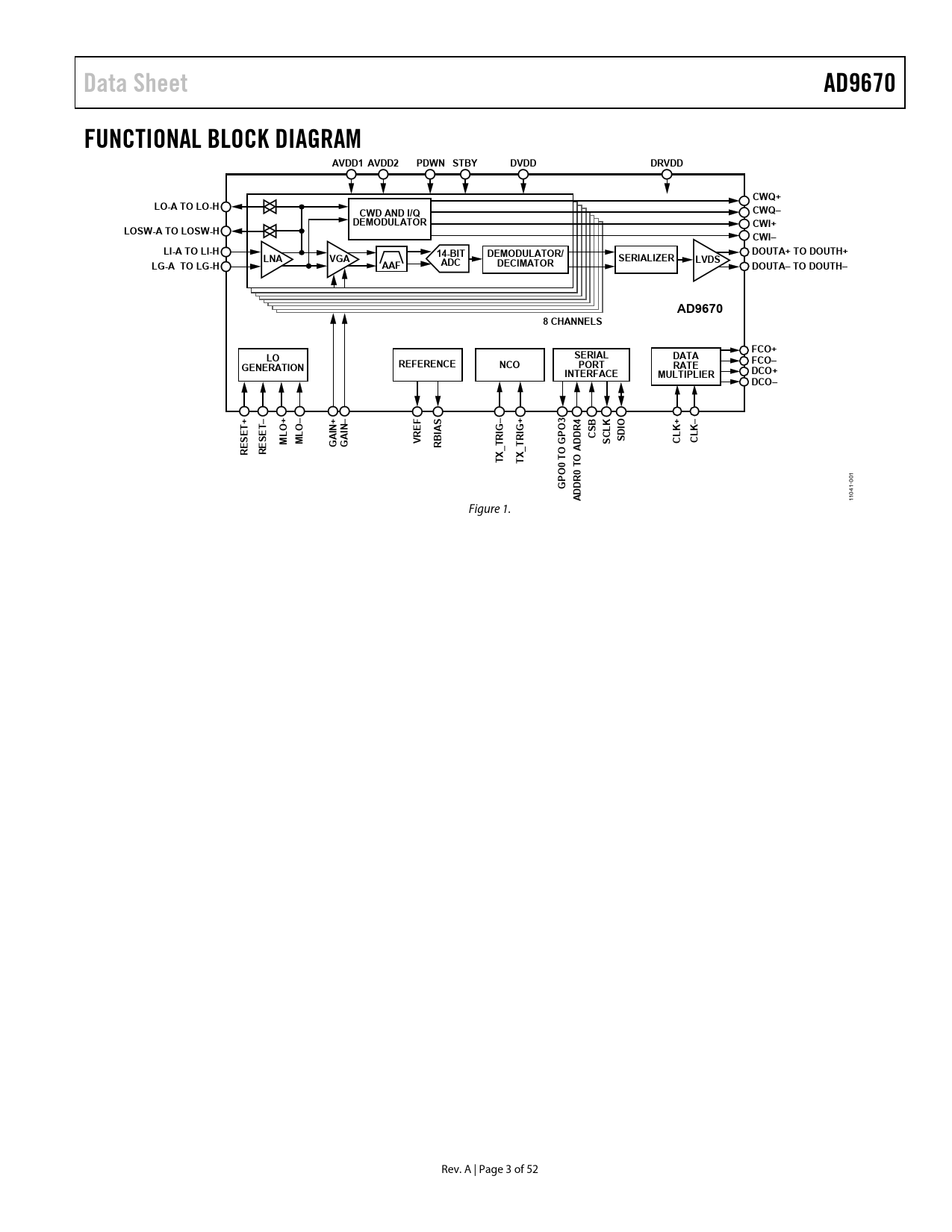 Data SheetAD9670FUNCTIONAL BLOCK DIAGRAMAVDD1 AVDD2PDWN STBYDVDDDRVDDCWQ+LO-A TO LO-HCWD AND I/QCWQ–DEMODULATORCWI+LOSW-A TO LOSW-HCWI–LI-A TO LI-H14-BITDEMODULATOR/DOUTA+ TO DOUTH+LNAVGASERIALIZERLVDSLG-A TO LG-HAAFADCDECIMATORDOUTA– TO DOUTH–AD96708 CHANNELSFCO+SERIALLODATAREFERENCENCOPORTFCO–GENERATIONRATEINTERFACEMULTIPLIERDCO+ DCO–+–+–+––BK+–OOEFININASO3IOLKKIGIG+PDR4CSMLMLVRRSDSCCLCLESETESETGAGARBIG_TR_TRROADTXTXTO TO0 GP 001 41- ADDR0 10 1 Figure 1. Rev. A | Page 3 of 52 Document Outline FEATURES APPLICATIONS GENERAL DESCRIPTION TABLE OF CONTENTS REVISION HISTORY FUNCTIONAL BLOCK DIAGRAM SPECIFICATIONS AC SPECIFICATIONS DIGITAL SPECIFICATIONS SWITCHING SPECIFICATIONS TIMING DIAGRAMS ADC Timing Diagram CW Timing Diagrams ABSOLUTE MAXIMUM RATINGS THERMAL IMPEDANCE ESD CAUTION PIN CONFIGURATION AND FUNCTION DESCRIPTIONS TYPICAL PERFORMANCE CHARACTERISTICS TGC MODE CHARACTERISTICS CW DOPPLER MODE CHARACTERISTICS THEORY OF OPERATION TGC OPERATION Low Noise Amplifier (LNA) Active Impedance Matching LNA Noise CLNA Connection DC Offset Correction/High-Pass Filter Variable Gain Amplifier (VGA) Gain Control VGA Noise Antialiasing Filter Antialiasing Filter/VGA Test Mode ADC Clock Input Considerations Clock Duty Cycle Considerations Clock Jitter Considerations Power Dissipation and Power-Down Mode Power and Ground Connection Recommendations Advanced Power Control Digital Outputs and Timing Output Zero Stuffing SDIO Pin SCLK Pin CSB Pin RBIAS Pin VREF Pin General-Purpose Output Pins Chip Address Pins ANALOG TEST SIGNAL GENERATION CW DOPPLER OPERATION Quadrature Generation I/Q Demodulator and Phase Shifter DIGITAL DEMODULATOR/DECIMATOR VECTOR PROFILE RF DECIMATOR DC Offset Calibration Multiband Antialiasing Filter and Decimate by 2 High-Pass Filter BASEBAND DEMODULATOR AND DECIMATOR Numerically Controlled Oscillator Decimation Filter Coefficient Memory DIGITAL TEST WAVEFORMS Waveform Generator Channel ID and Ramp Generator Filter Coefficients DIGITAL BLOCK POWER SAVING SCHEME SERIAL PORT INTERFACE (SPI) HARDWARE INTERFACE MEMORY MAP READING THE MEMORY MAP TABLE RESERVED LOCATIONS DEFAULT VALUES LOGIC LEVELS RECOMMENDED STARTUP SEQUENCE MEMORY MAP REGISTER DESCRIPTIONS Transfer (Register 0x0FF) Profile Index and Manual TX_TRIG (Register 0x10C) OUTLINE DIMENSIONS ORDERING GUIDE