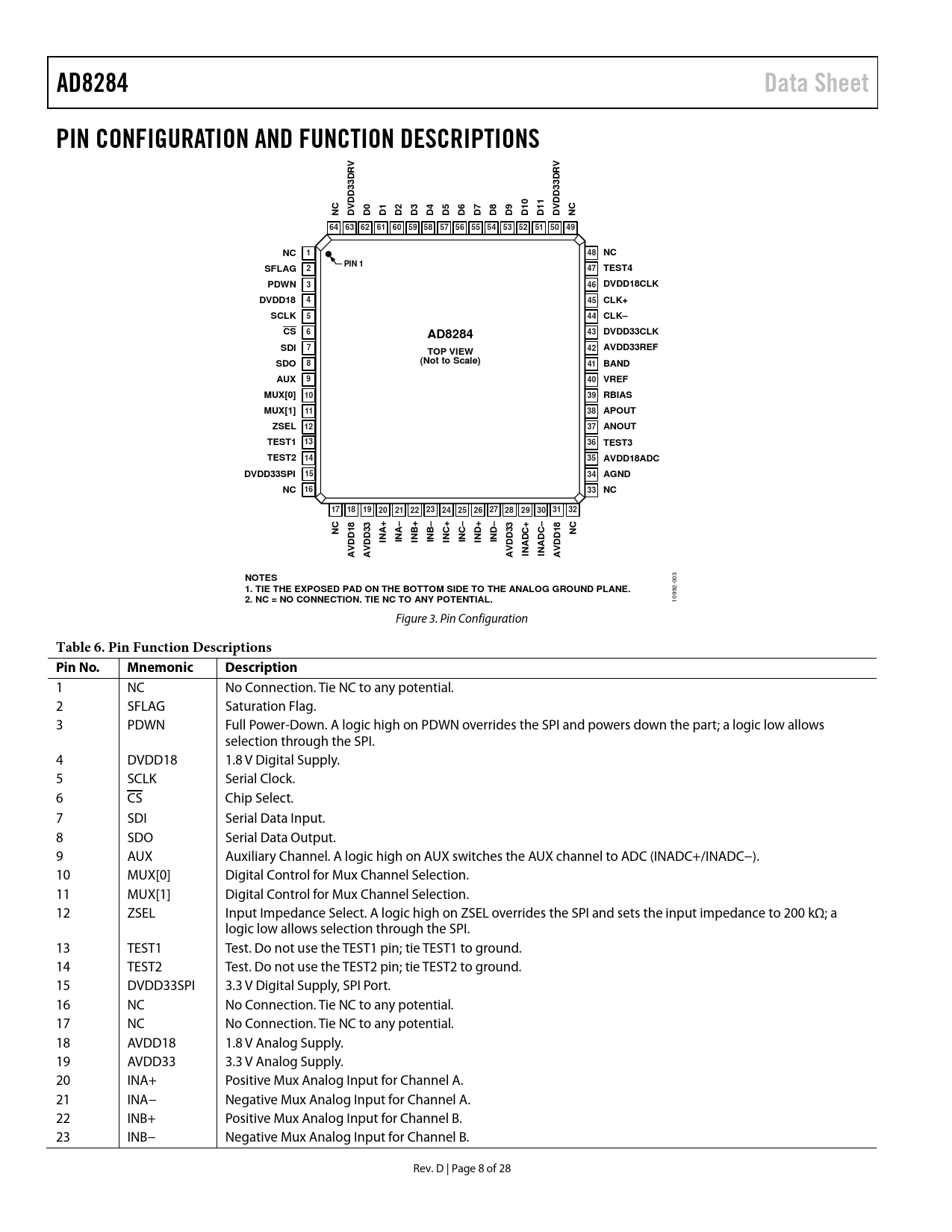 AD8284 Data Sheet PIN CONFIGURATION AND FUNCTION DESCRIPTIONS DD33DRV DD33DRV NC DV D0 D1 D2 D3 D4 D5 D6 D7 D8 D9 D10 D11 DV NC 64 63 62 61 60 59 58 57 56 55 54 53 52 51 50 49 NC 1 48 NC PIN 1 SFLAG 2 47 TEST4 PDWN 3 46 DVDD18CLK DVDD18 4 45 CLK+ SCLK 5 44 CLK– CS 6 AD8284 43 DVDD33CLK SDI 7 TOP VIEW 42 AVDD33REF (Not to Scale) SDO 8 41 BAND AUX 9 40 VREF MUX[0] 10 39 RBIAS MUX[1] 11 38 APOUT ZSEL 12 37 ANOUT TEST1 13 36 TEST3 TEST2 14 35 AVDD18ADC DVDD33SPI 15 34 AGND NC 16 33 NC 17 18 19 20 21 22 23 24 25 26 27 28 29 30 31 32 NC NC DD18 DD33 INA+ INA– INB+ INB– INC+ INC– IND+ IND– DD33 DD18 AV AV AV INADC+ INADC– AV NOTES