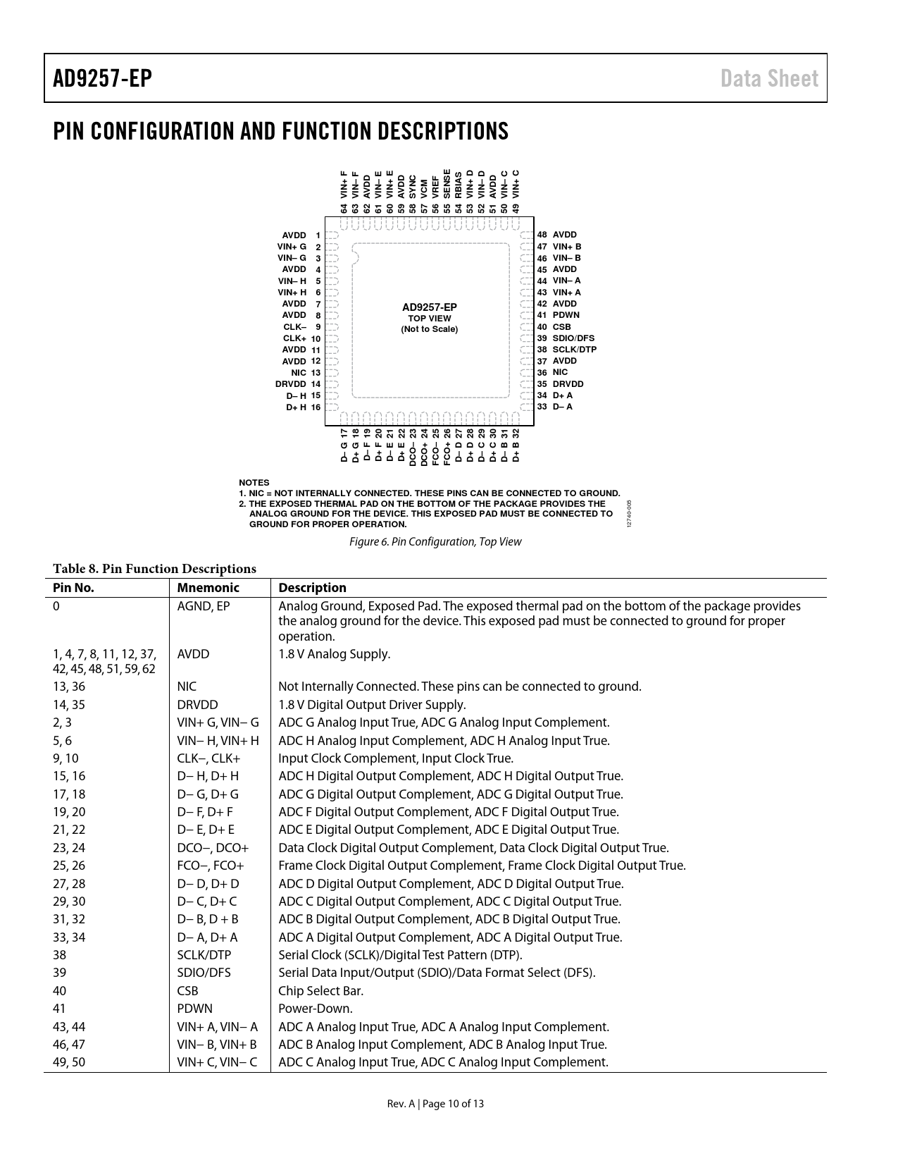 0 AGND, EP Analog Ground, Exposed Pad. The exposed thermal pad on the bottom of the package provides the analog ground for the device. This exposed pad must be connected to ground for proper operation. 1, 4, 7, 8, 11, 12, 37, AVDD 1.8 V Analog Supply. 42, 45, 48, 51, 59, 62 13, 36 NIC Not Internally Connected. These pins can be connected to ground. 14, 35 DRVDD 1.8 V Digital Output Driver Supply. 2, 3 VIN+ G, VIN− G ADC G Analog Input True, ADC G Analog Input Complement. 5, 6 VIN− H, VIN+ H ADC H Analog Input Complement, ADC H Analog Input True. 9, 10 CLK−, CLK+ Input Clock Complement, Input Clock True. 15, 16 D− H, D+ H ADC H Digital Output Complement, ADC H Digital Output True. 17, 18 D− G, D+ G ADC G Digital Output Complement, ADC G Digital Output True. 19, 20 D− F, D+ F ADC F Digital Output Complement, ADC F Digital Output True. 21, 22 D− E, D+ E ADC E Digital Output Complement, ADC E Digital Output True. 23, 24 DCO−, DCO+ Data Clock Digital Output Complement, Data Clock Digital Output True. 25, 26 FCO−, FCO+ Frame Clock Digital Output Complement, Frame Clock Digital Output True. 27, 28 D− D, D+ D ADC D Digital Output Complement, ADC D Digital Output True. 29, 30 D− C, D+ C ADC C Digital Output Complement, ADC C Digital Output True. 31, 32 D− B, D + B ADC B Digital Output Complement, ADC B Digital Output True. 33, 34 D− A, D+ A ADC A Digital Output Complement, ADC A Digital Output True. 38 SCLK/DTP Serial Clock (SCLK)/Digital Test Pattern (DTP). 39 SDIO/DFS Serial Data Input/Output (SDIO)/Data Format Select (DFS). 40 CSB Chip Select Bar. 41 PDWN Power-Down. 43, 44 VIN+ A, VIN− A ADC A Analog Input True, ADC A Analog Input Complement. 46, 47 VIN− B, VIN+ B ADC B Analog Input Complement, ADC B Analog Input True. 49, 50 VIN+ C, VIN− C ADC C Analog Input True, ADC C Analog Input Complement. Rev. A | Page 10 of 13 Document Outline FEATURES ENHANCED PRODUCT FEATURES APPLICATIONS GENERAL DESCRIPTION FUNCTIONAL BLOCK DIAGRAM PRODUCT HIGHLIGHTS TABLE OF CONTENTS REVISION HISTORY SPECIFICATIONS DC SPECIFICATIONS AC SPECIFICATIONS DIGITAL SPECIFICATIONS SWITCHING SPECIFICATIONS TIMING SPECIFICATIONS Timing Diagrams ABSOLUTE MAXIMUM RATINGS THERMAL CHARACTERISTICS ESD CAUTION PIN CONFIGURATION AND FUNCTION DESCRIPTIONS TYPICAL PERFORMANCE CHARACTERISTICS OUTLINE DIMENSIONS ORDERING GUIDE