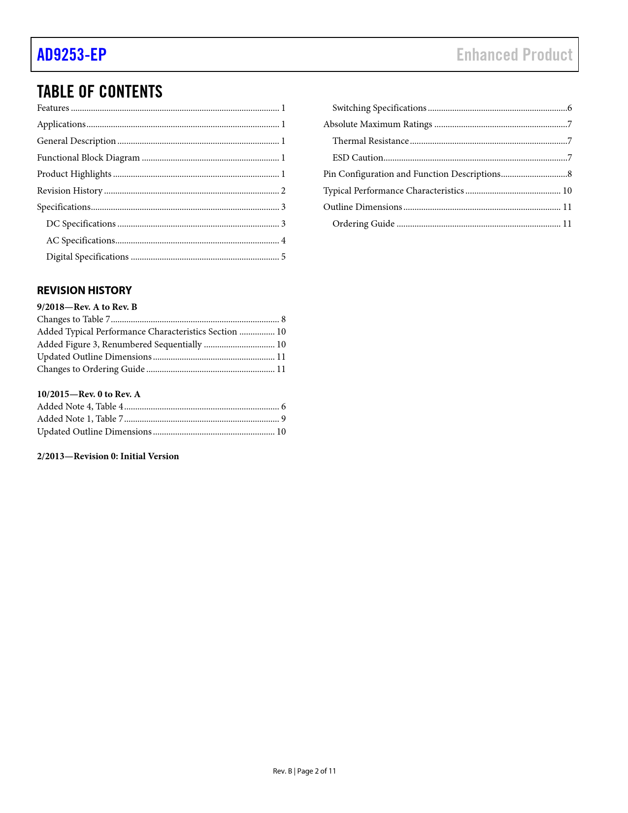 link to page 1 link to page 1 link to page 1 link to page 1 link to page 1 link to page 2 link to page 3 link to page 3 link to page 4 link to page 5 link to page 6 link to page 7 link to page 7 link to page 7 link to page 8 link to page 10 link to page 11 link to page 11 AD9253-EPEnhanced ProductTABLE OF CONTENTS Features .. 1 Switching Specifications ...6 Applications ... 1 Absolute Maximum Ratings ..7 General Description ... 1 Thermal Resistance ...7 Functional Block Diagram .. 1 ESD Caution...7 Product Highlights ... 1 Pin Configuration and Function Descriptions ..8 Revision History ... 2 Typical Performance Characteristics ... 10 Specifications ... 3 Outline Dimensions ... 11 DC Specifications ... 3 Ordering Guide .. 11 AC Specifications .. 4 Digital Specifications ... 5 REVISION HISTORY 9/2018—Rev. A to Rev. B Changes to Table 7 .. 8 Added Typical Performance Characteristics Section .. 10 Added Figure 3, Renumbered Sequential y .. 10 Updated Outline Dimensions ... 11 Changes to Ordering Guide .. 11 10/2015—Rev. 0 to Rev. A Added Note 4, Table 4 .. 6 Added Note 1, Table 7 .. 9 Updated Outline Dimensions ... 10 2/2013—Revision 0: Initial Version Rev. B | Page 2 of 11 Document Outline Features Applications General Description Functional Block Diagram Product Highlights Revision History Specifications DC Specifications AC Specifications Digital Specifications Switching Specifications Absolute Maximum Ratings Thermal Resistance ESD Caution Pin Configuration and Function Descriptions Typical Performance Characteristics Outline Dimensions Ordering Guide