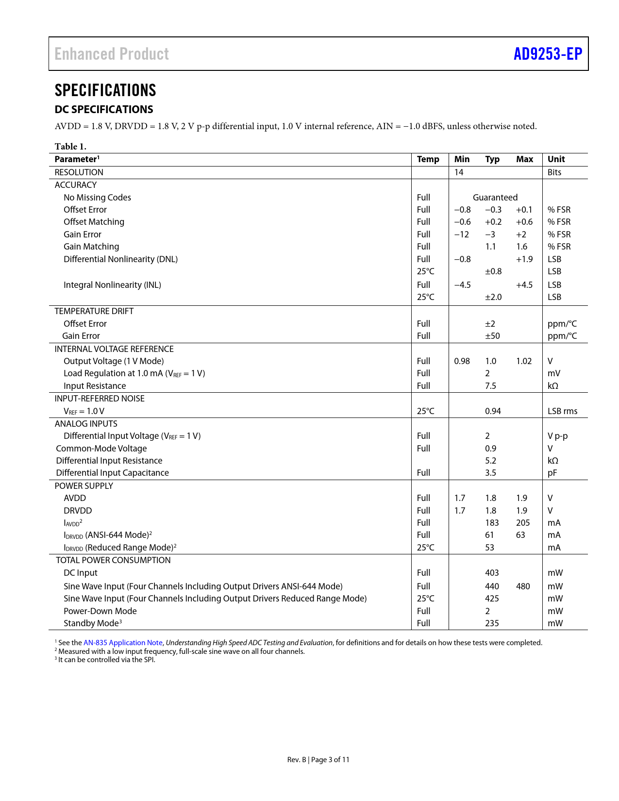 Enhanced ProductAD9253-EPSPECIFICATIONS DC SPECIFICATIONS AVDD = 1.8 V, DRVDD = 1.8 V, 2 V p-p differential input, 1.0 V internal reference, AIN = −1.0 dBFS, unless otherwise noted. Table 1. Parameter1TempMinTypMaxUnit RESOLUTION 14 Bits ACCURACY No Missing Codes Full Guaranteed Offset Error Full −0.8 −0.3 +0.1 % FSR Offset Matching Full −0.6 +0.2 +0.6 % FSR Gain Error Full −12 −3 +2 % FSR Gain Matching Full 1.1 1.6 % FSR Differential Nonlinearity (DNL) Full −0.8 +1.9 LSB 25°C ±0.8 LSB Integral Nonlinearity (INL) Full −4.5 +4.5 LSB 25°C ±2.0 LSB TEMPERATURE DRIFT Offset Error Full ±2 ppm/°C Gain Error Full ±50 ppm/°C INTERNAL VOLTAGE REFERENCE Output Voltage (1 V Mode) Full 0.98 1.0 1.02 V Load Regulation at 1.0 mA (VREF = 1 V) Full 2 mV Input Resistance Full 7.5 kΩ INPUT-REFERRED NOISE VREF = 1.0 V 25°C 0.94 LSB rms ANALOG INPUTS Differential Input Voltage (VREF = 1 V) Full 2 V p-p Common-Mode Voltage Full 0.9 V Differential Input Resistance 5.2 kΩ Differential Input Capacitance Full 3.5 pF POWER SUPPLY AVDD Full 1.7 1.8 1.9 V DRVDD Full 1.7 1.8 1.9 V I 2 AVDD Full 183 205 mA IDRVDD (ANSI-644 Mode)2 Full 61 63 mA IDRVDD (Reduced Range Mode)2 25°C 53 mA TOTAL POWER CONSUMPTION DC Input Full 403 mW Sine Wave Input (Four Channels Including Output Drivers ANSI-644 Mode) Full 440 480 mW Sine Wave Input (Four Channels Including Output Drivers Reduced Range Mode) 25°C 425 mW Power-Down Mode Full 2 mW Standby Mode3 Full 235 mW 1 See the AN-835 Application Note, Understanding High Speed ADC Testing and Evaluation, for definitions and for details on how these tests were completed. 2 Measured with a low input frequency, full-scale sine wave on all four channels. 3 It can be control ed via the SPI. Rev. B | Page 3 of 11 Document Outline Features Applications General Description Functional Block Diagram Product Highlights Revision History Specifications DC Specifications AC Specifications Digital Specifications Switching Specifications Absolute Maximum Ratings Thermal Resistance ESD Caution Pin Configuration and Function Descriptions Typical Performance Characteristics Outline Dimensions Ordering Guide