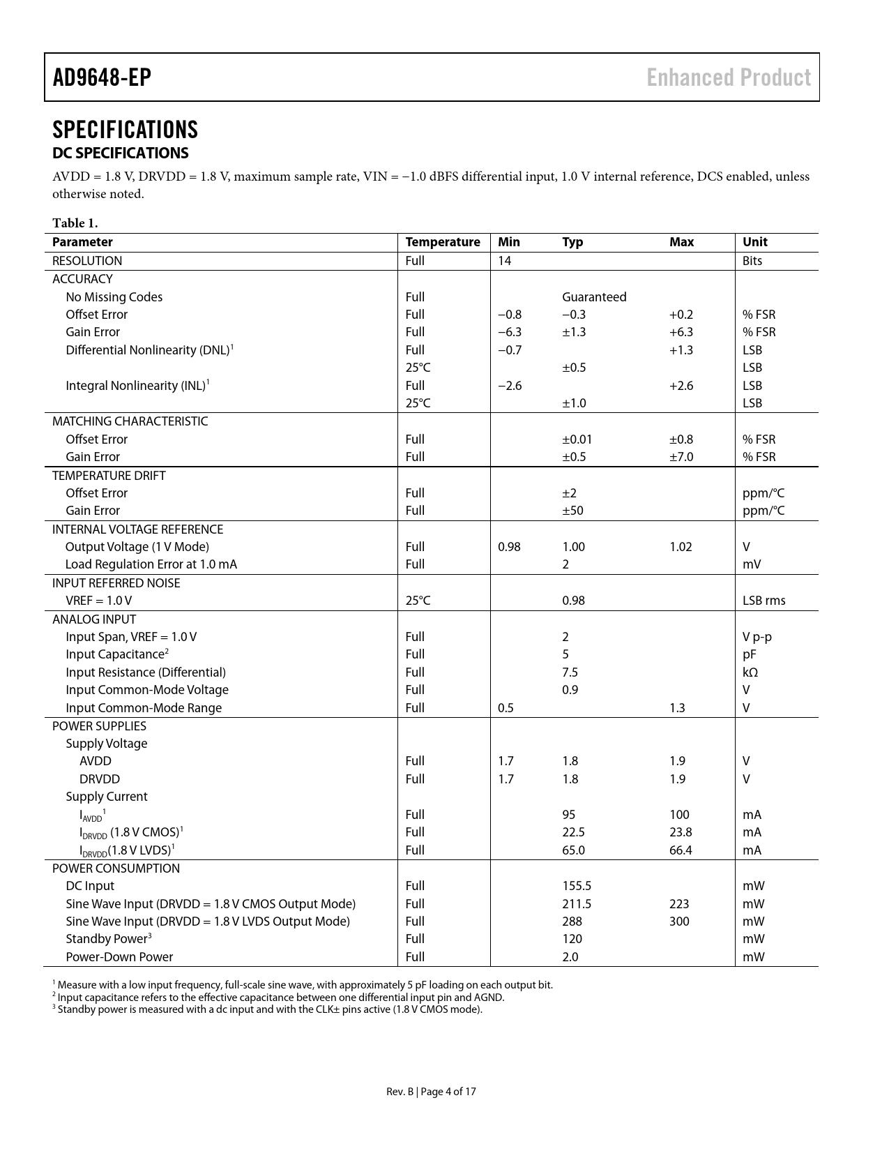 AD9648-EP. Enhanced Product. SPECIFICATIONS DC SPECIFICATIONS. Table 1. Parameter. Temperature Min. Typ. Max. Unit