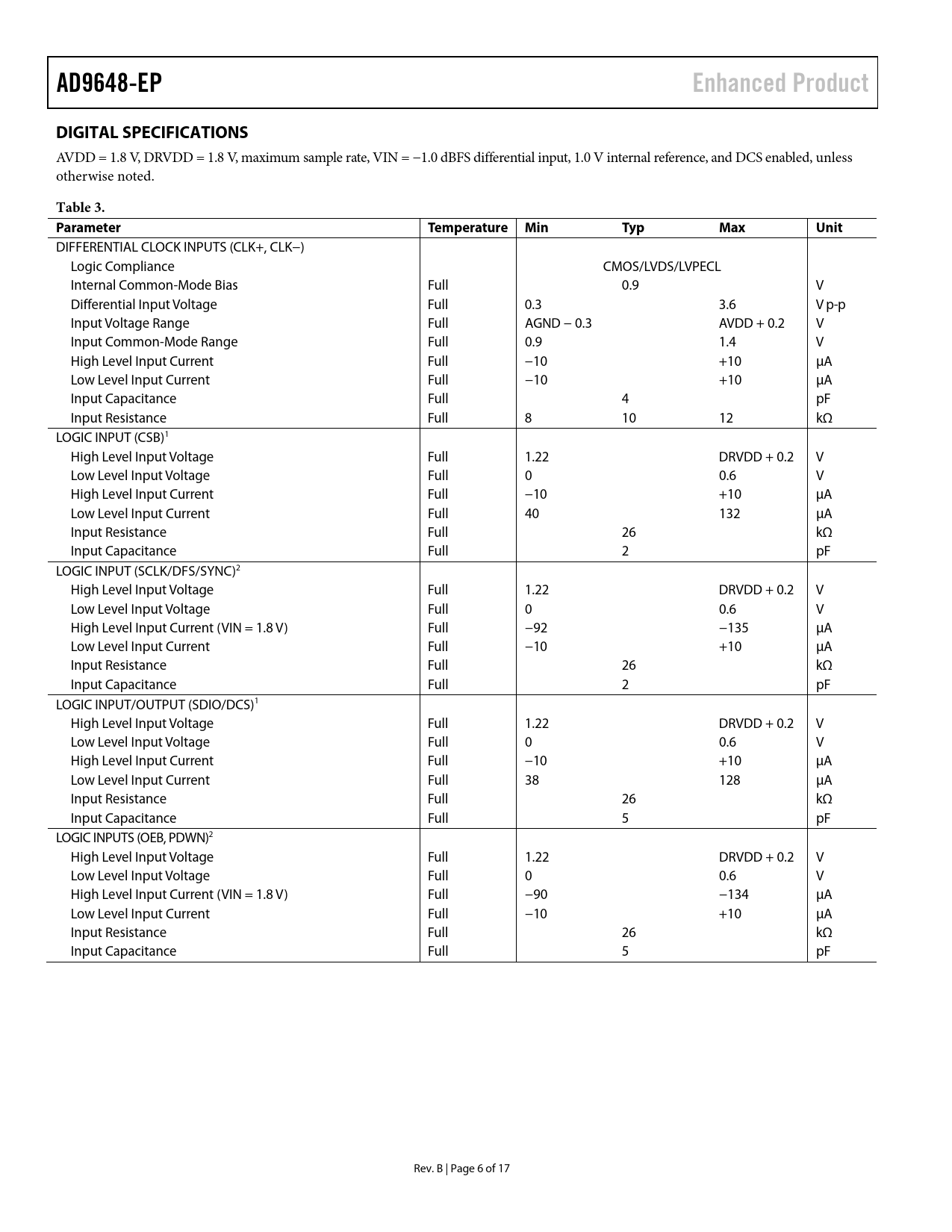 AD9648-EP. Enhanced Product. DIGITAL SPECIFICATIONS. Table 3. Parameter. Temperature Min. Typ. Max. Unit