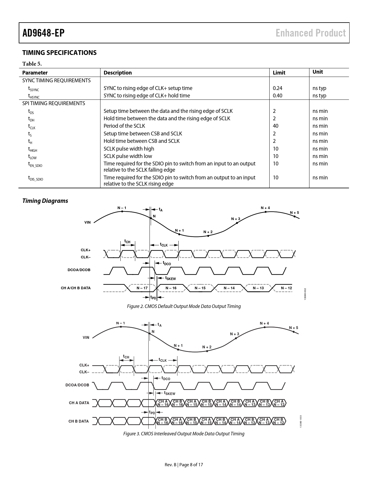 AD9648-EP Enhanced Product TIMING SPECIFICATIONS Table 5 Parameter Description Limit Unit Timing Diagrams N – 1 N + 4 N + 5