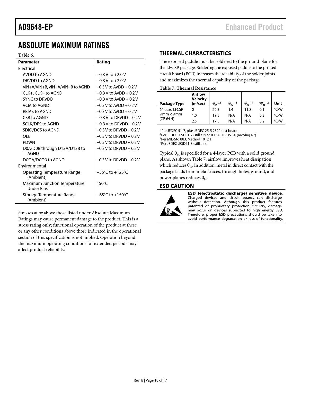 link to page 10 AD9648-EPEnhanced ProductABSOLUTE MAXIMUM RATINGS Table 6.THERMAL CHARACTERISTICSParameterRating The exposed paddle must be soldered to the ground plane for Electrical the LFCSP package. Soldering the exposed paddle to the printed AVDD to AGND −0.3 V to +2.0 V circuit board (PCB) increases the reliability of the solder joints DRVDD to AGND −0.3 V to +2.0 V and maximizes the thermal capability of the package. VIN+A/VIN+B, VIN−A/VIN−B to AGND −0.3 V to AVDD + 0.2 V Table 7. Thermal Resistance CLK+, CLK− to AGND −0.3 V to AVDD + 0.2 V Airflow SYNC to DRVDD −0.3 V to AVDD + 0.2 V Velocity1, 21, 31, 41,2 VCM to AGND −0.3 V to AVDD + 0.2 V Package Type(m/sec)θJAθJCθJB Ψ JT Unit RBIAS to AGND −0.3 V to AVDD + 0.2 V 64-Lead LFCSP 0 22.3 1.4 11.8 0.1 °C/W 9 mm × 9 mm CSB to AGND −0.3 V to DRVDD + 0.2 V 1.0 19.5 N/A N/A 0.2 °C/W (CP-64-4) 2.5 17.5 N/A N/A 0.2 °C/W SCLK/DFS to AGND −0.3 V to DRVDD + 0.2 V SDIO/DCS to AGND −0.3 V to DRVDD + 0.2 V 1 Per JEDEC 51-7, plus JEDEC 25-5 2S2P test board. OEB −0.3 V to DRVDD + 0.2 V 2 Per JEDEC JESD51-2 (stil air) or JEDEC JESD51-6 (moving air). 3 Per MIL-Std 883, Method 1012.1. PDWN −0.3 V to DRVDD + 0.2 V 4 Per JEDEC JESD51-8 (still air). D0A/D0B through D13A/D13B to −0.3 V to DRVDD + 0.2 V AGND Typical θJA is specified for a 4-layer PCB with a solid ground DCOA/DCOB to AGND −0.3 V to DRVDD + 0.2 V plane. As shown Table 7, airflow improves heat dissipation, Environmental which reduces θJA. In addition, metal in direct contact with the Operating Temperature Range −55°C to +125°C package leads from metal traces, through holes, ground, and (Ambient) power planes reduces θJA. Maximum Junction Temperature 150°C ESD CAUTION Under Bias Storage Temperature Range −65°C to +150°C (Ambient) Stresses at or above those listed under Absolute Maximum Ratings may cause permanent damage to the product. This is a stress rating only; functional operation of the product at these or any other conditions above those indicated in the operational section of this specification is not implied. Operation beyond the maximum operating conditions for extended periods may affect product reliability. Rev. B | Page 10 of 17 Document Outline FEATURES ENHANCED PRODUCT FEATURES APPLICATIONS FUNCTIONAL BLOCK DIAGRAM PRODUCT HIGHLIGHTS TABLE OF CONTENTS REVISION HISTORY GENERAL DESCRIPTION SPECIFICATIONS DC SPECIFICATIONS AC SPECIFICATIONS DIGITAL SPECIFICATIONS SWITCHING SPECIFICATIONS TIMING SPECIFICATIONS Timing Diagrams ABSOLUTE MAXIMUM RATINGS THERMAL CHARACTERISTICS ESD CAUTION PIN CONFIGURATIONS AND FUNCTION DESCRIPTIONS OUTLINE DIMENSIONS ORDERING GUIDE