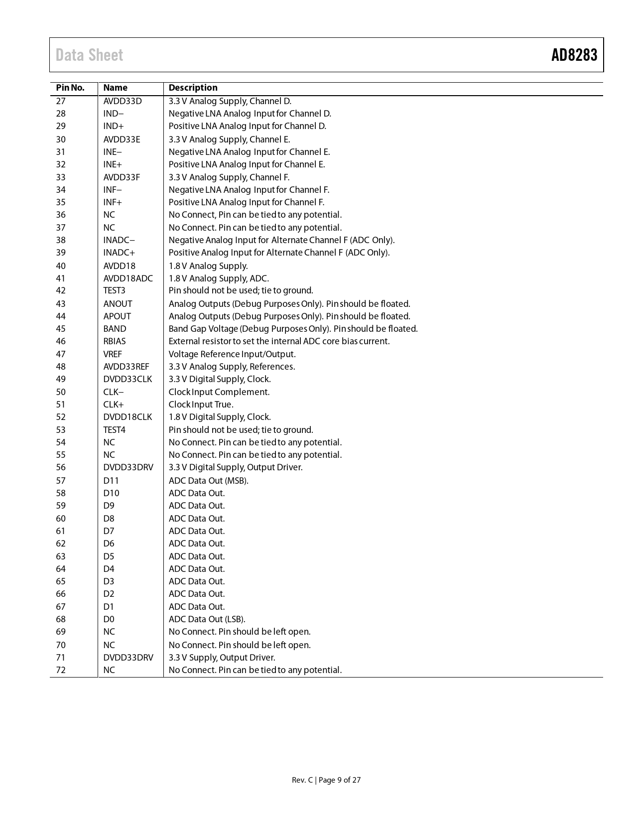 Data SheetAD8283Pin No.NameDescription 27 AVDD33D 3.3 V Analog Supply, Channel D. 28 IND− Negative LNA Analog Input for Channel D. 29 IND+ Positive LNA Analog Input for Channel D. 30 AVDD33E 3.3 V Analog Supply, Channel E. 31 INE− Negative LNA Analog Input for Channel E. 32 INE+ Positive LNA Analog Input for Channel E. 33 AVDD33F 3.3 V Analog Supply, Channel F. 34 INF− Negative LNA Analog Input for Channel F. 35 INF+ Positive LNA Analog Input for Channel F. 36 NC No Connect, Pin can be tied to any potential. 37 NC No Connect. Pin can be tied to any potential. 38 INADC− Negative Analog Input for Alternate Channel F (ADC Only). 39 INADC+ Positive Analog Input for Alternate Channel F (ADC Only). 40 AVDD18 1.8 V Analog Supply. 41 AVDD18ADC 1.8 V Analog Supply, ADC. 42 TEST3 Pin should not be used; tie to ground. 43 ANOUT Analog Outputs (Debug Purposes Only). Pin should be floated. 44 APOUT Analog Outputs (Debug Purposes Only). Pin should be floated. 45 BAND Band Gap Voltage (Debug Purposes Only). Pin should be floated. 46 RBIAS External resistor to set the internal ADC core bias current. 47 VREF Voltage Reference Input/Output. 48 AVDD33REF 3.3 V Analog Supply, References. 49 DVDD33CLK 3.3 V Digital Supply, Clock. 50 CLK− Clock Input Complement. 51 CLK+ Clock Input True. 52 DVDD18CLK 1.8 V Digital Supply, Clock. 53 TEST4 Pin should not be used; tie to ground. 54 NC No Connect. Pin can be tied to any potential. 55 NC No Connect. Pin can be tied to any potential. 56 DVDD33DRV 3.3 V Digital Supply, Output Driver. 57 D11 ADC Data Out (MSB). 58 D10 ADC Data Out. 59 D9 ADC Data Out. 60 D8 ADC Data Out. 61 D7 ADC Data Out. 62 D6 ADC Data Out. 63 D5 ADC Data Out. 64 D4 ADC Data Out. 65 D3 ADC Data Out. 66 D2 ADC Data Out. 67 D1 ADC Data Out. 68 D0 ADC Data Out (LSB). 69 NC No Connect. Pin should be left open. 70 NC No Connect. Pin should be left open. 71 DVDD33DRV 3.3 V Supply, Output Driver. 72 NC No Connect. Pin can be tied to any potential. Rev. C | Page 9 of 27 Document Outline Features Applications Functional Block Diagram General Description Table of Contents Revision History Specifications AC Specifications Digital Specifications Switching Specifications Absolute Maximum Ratings ESD Caution Pin Configuration and Function Descriptions Typical Performance Characteristics Theory of Operation Radar Receive Path AFE Channel Overview Low Noise Amplifier (LNA) Recommendation Antialiasing Filter (AAF) Mux and Mux Controller ADC Clock Input Considerations Clock Duty Cycle Considerations Clock Jitter Considerations SDIO Pin SCLK Pin CS Pin RBIAS Pin Voltage Reference Power and Ground Recommendations Exposed Paddle Thermal Heat Slug Recommendations Serial Peripheral Interface (SPI) Hardware Interface Memory Map Reading the Memory Map Table Logic Levels Reserved Locations Default Values Application Diagrams Outline Dimensions Ordering Guide Automotive Products