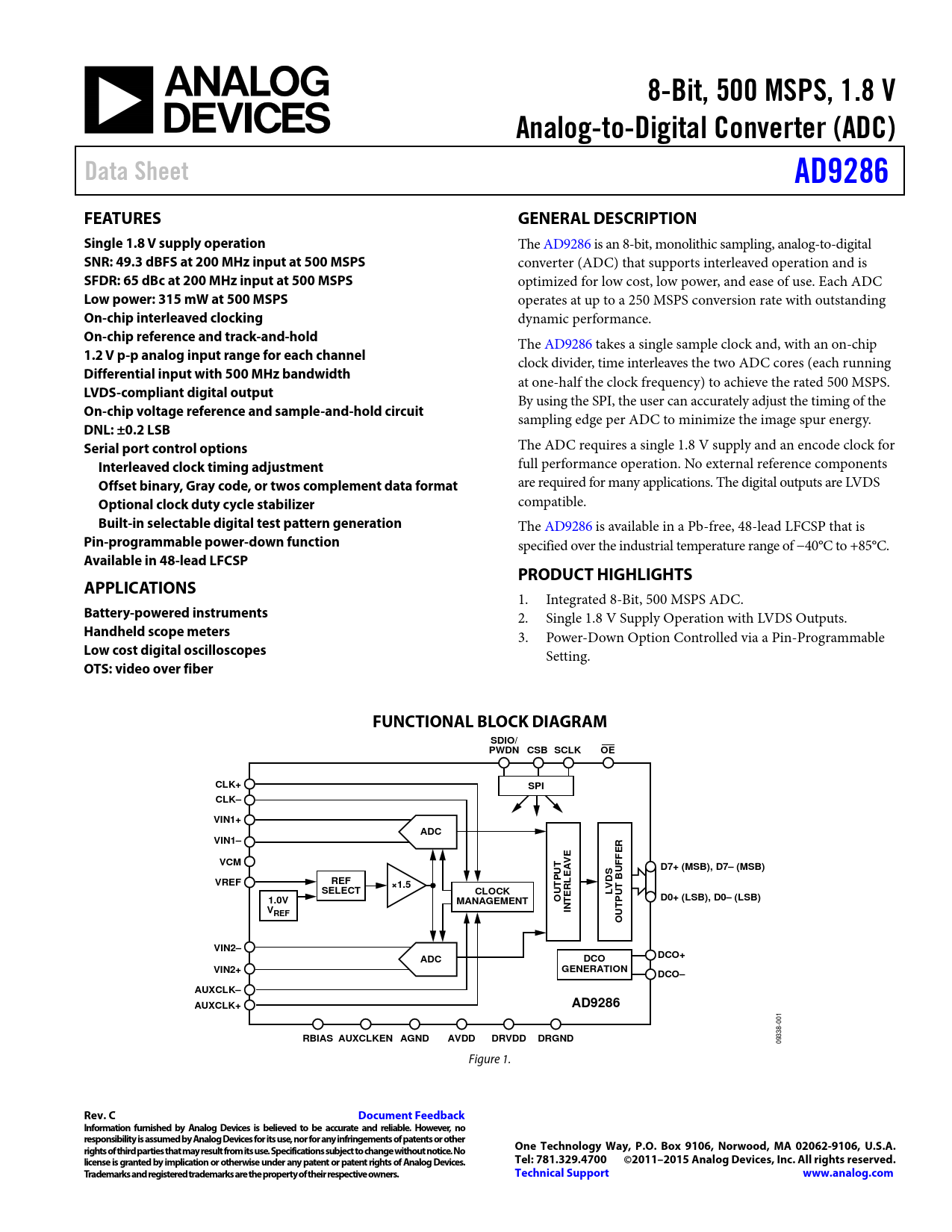 8-Bit, 500 MSPS, 1.8 V. Analog-to-Digital Converter (ADC). Data Sheet. AD9286. FEATURES. GENERAL DESCRIPTION