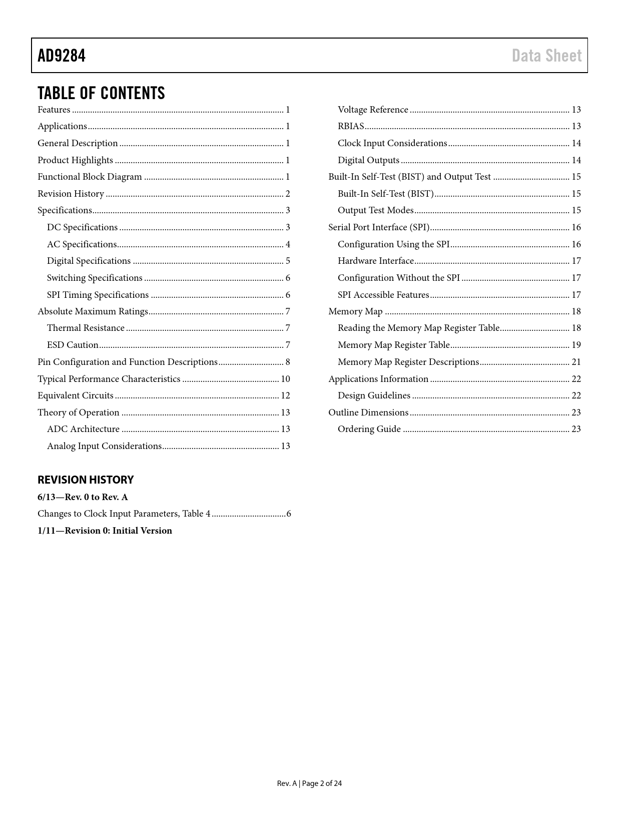 link to page 1 link to page 1 link to page 1 link to page 1 link to page 1 link to page 2 link to page 3 link to page 3 link to page 4 link to page 5 link to page 5 link to page 6 link to page 7 link to page 7 link to page 7 link to page 7 link to page 10 link to page 11 link to page 13 link to page 13 link to page 13 link to page 13 link to page 13 link to page 14 link to page 14 link to page 15 link to page 15 link to page 15 link to page 16 link to page 16 link to page 17 link to page 17 link to page 17 link to page 18 link to page 18 link to page 19 link to page 21 link to page 22 link to page 22 link to page 23 link to page 23 AD9284Data SheetTABLE OF CONTENTS Features .. 1 Voltage Reference ... 13 Applications ... 1 RBIAS ... 13 General Description ... 1 Clock Input Considerations .. 14 Product Highlights ... 1 Digital Outputs ... 14 Functional Block Diagram .. 1 Built-In Self-Test (BIST) and Output Test .. 15 Revision History ... 2 Built-In Self-Test (BIST) .. 15 Specifications ... 3 Output Test Modes ... 15 DC Specifications ... 3 Serial Port Interface (SPI) .. 16 AC Specifications .. 4 Configuration Using the SPI ... 16 Digital Specifications ... 5 Hardware Interface ... 17 Switching Specifications .. 6 Configuration Without the SPI .. 17 SPI Timing Specifications ... 6 SPI Accessible Features .. 17 Absolute Maximum Ratings .. 7 Memory Map .. 18 Thermal Resistance .. 7 Reading the Memory Map Register Table ... 18 ESD Caution .. 7 Memory Map Register Table ... 19 Pin Configuration and Function Descriptions ... 8 Memory Map Register Descriptions .. 21 Typical Performance Characteristics ... 10 Applications Information .. 22 Equivalent Circuits ... 12 Design Guidelines .. 22 Theory of Operation .. 13 Outline Dimensions ... 23 ADC Architecture .. 13 Ordering Guide .. 23 Analog Input Considerations .. 13 REVISION HISTORY 6/13—Rev. 0 to Rev. A Changes to Clock Input Parameters, Table 4 ... 6 1/11—Revision 0: Initial Version Rev. A | Page 2 of 24 Document Outline Features Applications General Description Product Highlights Functional Block Diagram Revision History Specifications DC Specifications AC Specifications Digital Specifications Switching Specifications SPI Timing Specifications Timing Diagram Absolute Maximum Ratings Thermal Resistance ESD Caution Pin Configuration and Function Descriptions Typical Performance Characteristics Equivalent Circuits Theory of Operation ADC Architecture Analog Input Considerations Differential Input Configurations Voltage Reference RBIAS Clock Input Considerations Clock Input Options Digital Outputs Digital Output Enable Function () Built-In Self-Test (BIST) and Output Test Built-In Self-Test (BIST) Output Test Modes Serial Port Interface (SPI) Configuration Using the SPI Hardware Interface Configuration Without the SPI SPI Accessible Features Memory Map Reading the Memory Map Register Table Open Locations Default Values Logic Levels Transfer Register Map Channel-Specific Registers Memory Map Register Table Memory Map Register Descriptions Voltage Reference (Register 0x18) Bits[7:5]—Reserved Bits[4:0]—Voltage Reference Applications Information Design Guidelines Power and Ground Recommendations Exposed Paddle Thermal Heat Sink Recommendations VCM RBIAS Reference Decoupling SPI Port Outline Dimensions Ordering Guide