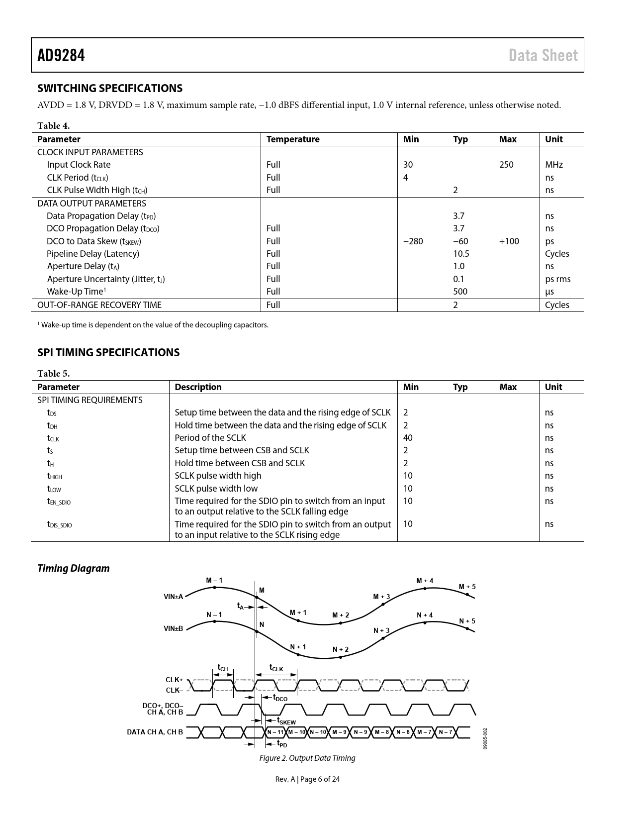 link to page 6 AD9284Data SheetSWITCHING SPECIFICATIONS AVDD = 1.8 V, DRVDD = 1.8 V, maximum sample rate, −1.0 dBFS differential input, 1.0 V internal reference, unless otherwise noted. Table 4. Parameter TemperatureMinTypMaxUnit CLOCK INPUT PARAMETERS Input Clock Rate Full 30 250 MHz CLK Period (tCLK) Full 4 ns CLK Pulse Width High (tCH) Full 2 ns DATA OUTPUT PARAMETERS Data Propagation Delay (tPD) 3.7 ns DCO Propagation Delay (tDCO) Full 3.7 ns DCO to Data Skew (tSKEW) Full −280 −60 +100 ps Pipeline Delay (Latency) Full 10.5 Cycles Aperture Delay (tA) Full 1.0 ns Aperture Uncertainty (Jitter, tJ) Full 0.1 ps rms Wake-Up Time1 Full 500 μs OUT-OF-RANGE RECOVERY TIME Full 2 Cycles 1 Wake-up time is dependent on the value of the decoupling capacitors. SPI TIMING SPECIFICATIONSTable 5. ParameterDescriptionMinTypMaxUnit SPI TIMING REQUIREMENTS tDS Setup time between the data and the rising edge of SCLK 2 ns tDH Hold time between the data and the rising edge of SCLK 2 ns tCLK Period of the SCLK 40 ns tS Setup time between CSB and SCLK 2 ns tH Hold time between CSB and SCLK 2 ns tHIGH SCLK pulse width high 10 ns tLOW SCLK pulse width low 10 ns tEN_SDIO Time required for the SDIO pin to switch from an input 10 ns to an output relative to the SCLK falling edge tDIS_SDIO Time required for the SDIO pin to switch from an output 10 ns to an input relative to the SCLK rising edge Timing DiagramM – 1M + 4M + 5MVIN±AM + 3tAM + 1N – 1M + 2N + 4N + 5NVIN±BN + 3N + 1N + 2tCHtCLKCLK+ CLK–tDCODCO+, DCO–CH A, CH BtSKEWDATA CH A, CH BN – 11 M – 10 N – 10M – 9N – 9M – 8N – 8M – 7N – 7 002 t 85- PD 090 Figure 2. Output Data Timing Rev. A | Page 6 of 24 Document Outline Features Applications General Description Product Highlights Functional Block Diagram Revision History Specifications DC Specifications AC Specifications Digital Specifications Switching Specifications SPI Timing Specifications Timing Diagram Absolute Maximum Ratings Thermal Resistance ESD Caution Pin Configuration and Function Descriptions Typical Performance Characteristics Equivalent Circuits Theory of Operation ADC Architecture Analog Input Considerations Differential Input Configurations Voltage Reference RBIAS Clock Input Considerations Clock Input Options Digital Outputs Digital Output Enable Function () Built-In Self-Test (BIST) and Output Test Built-In Self-Test (BIST) Output Test Modes Serial Port Interface (SPI) Configuration Using the SPI Hardware Interface Configuration Without the SPI SPI Accessible Features Memory Map Reading the Memory Map Register Table Open Locations Default Values Logic Levels Transfer Register Map Channel-Specific Registers Memory Map Register Table Memory Map Register Descriptions Voltage Reference (Register 0x18) Bits[7:5]—Reserved Bits[4:0]—Voltage Reference Applications Information Design Guidelines Power and Ground Recommendations Exposed Paddle Thermal Heat Sink Recommendations VCM RBIAS Reference Decoupling SPI Port Outline Dimensions Ordering Guide