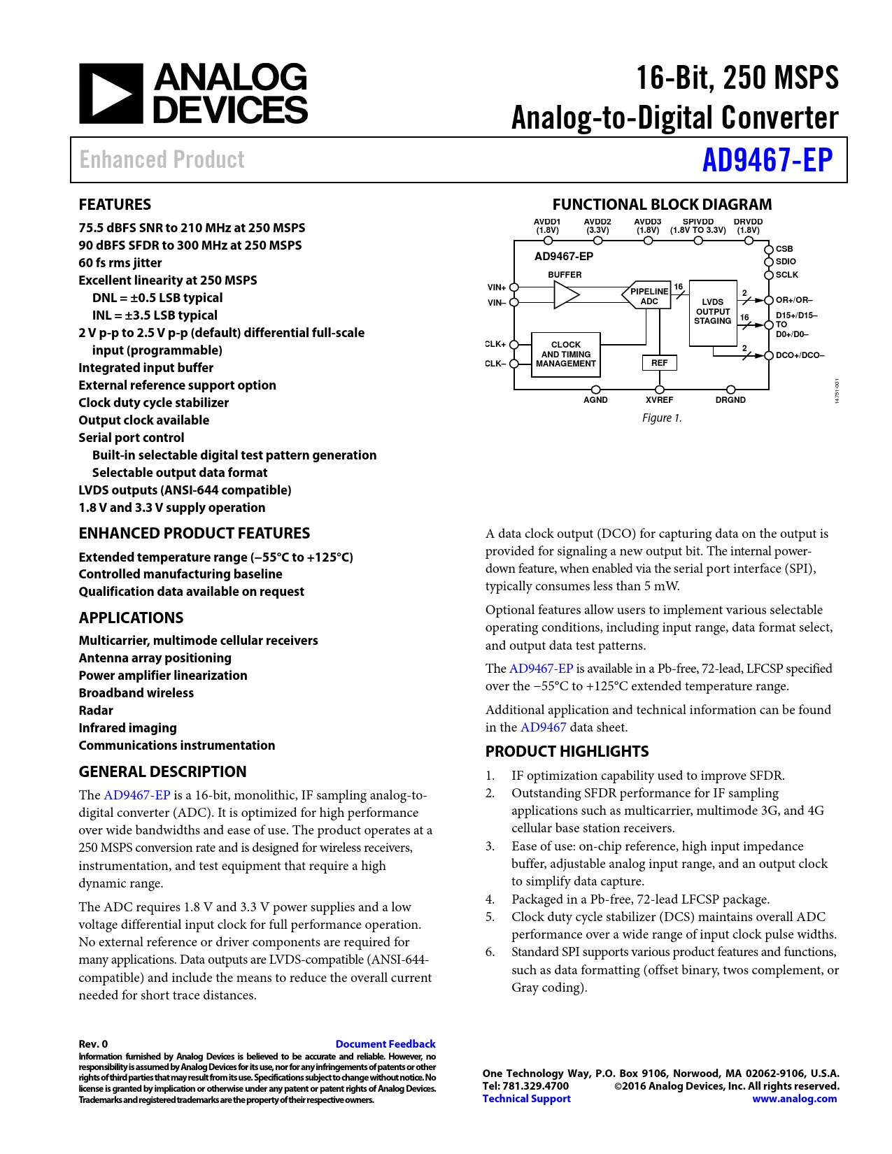 16-Bit, 250 MSPS. Analog-to-Digital Converter. Enhanced Product. AD9467-EP. FEATURES. FUNCTIONAL BLOCK DIAGRAM