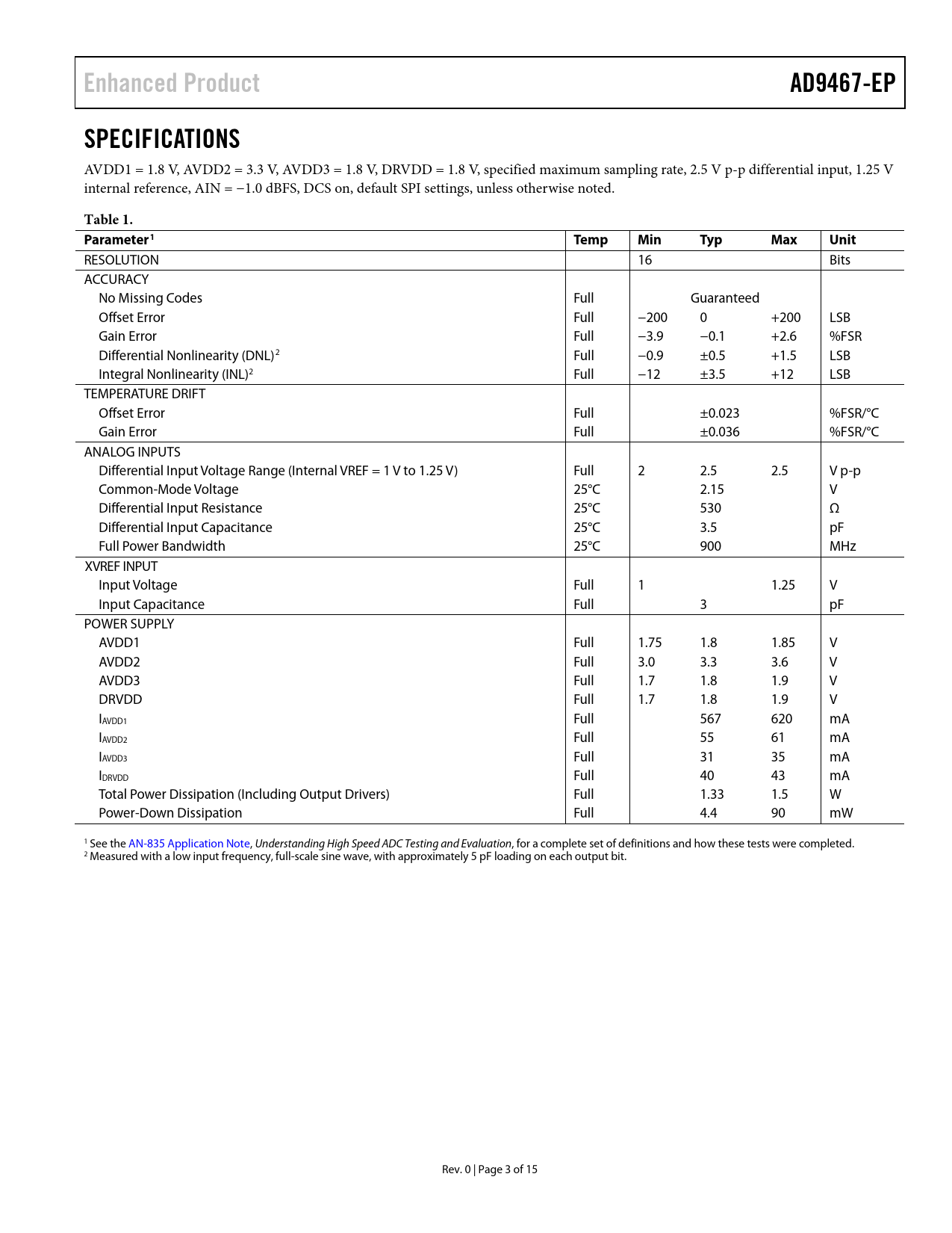 Enhanced Product. AD9467-EP. SPECIFICATIONS. Table 1. Parameter1. Temp. Min. Typ. Max. Unit