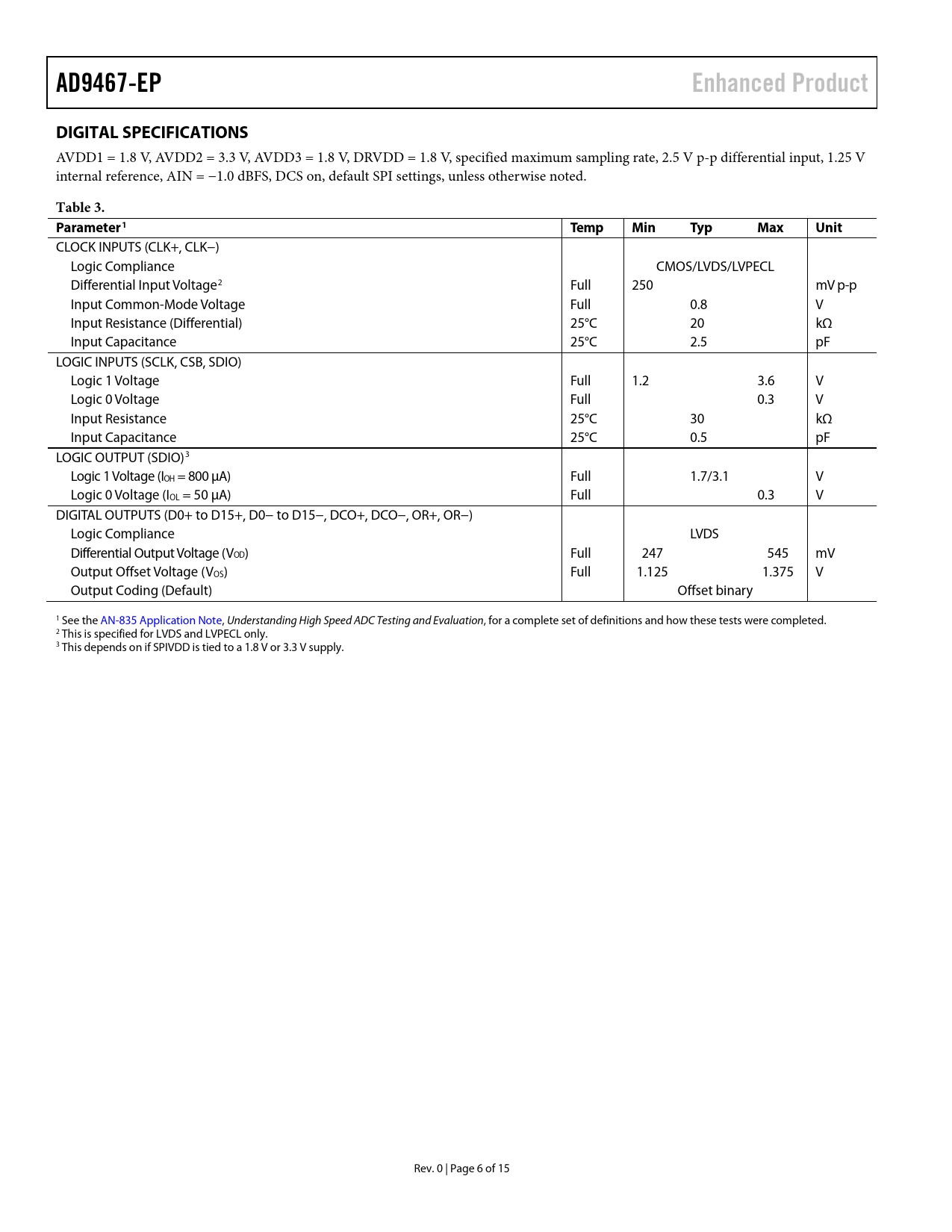 Páginas / Página15 / 6 — AD9467-EP. Enhanced Product. DIGITAL SPECIFICATIONS. Table 3. Parameter1. …