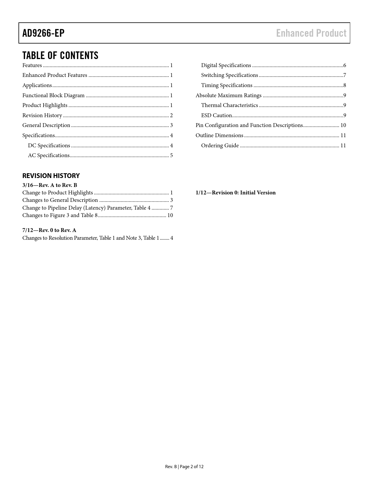 AD9266-EP Enhanced Product TABLE OF CONTENTS REVISION HISTORY 3/16—Rev A to Rev B 1/12—Revision 0: Initial Version