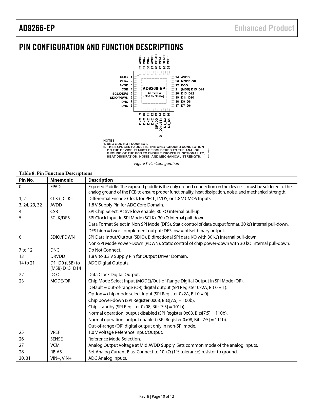 Páginas / Página12 / 10 — AD9266-EP. Enhanced Product. PIN CONFIGURATION AND FUNCTION DESCRIPTIONS. …
