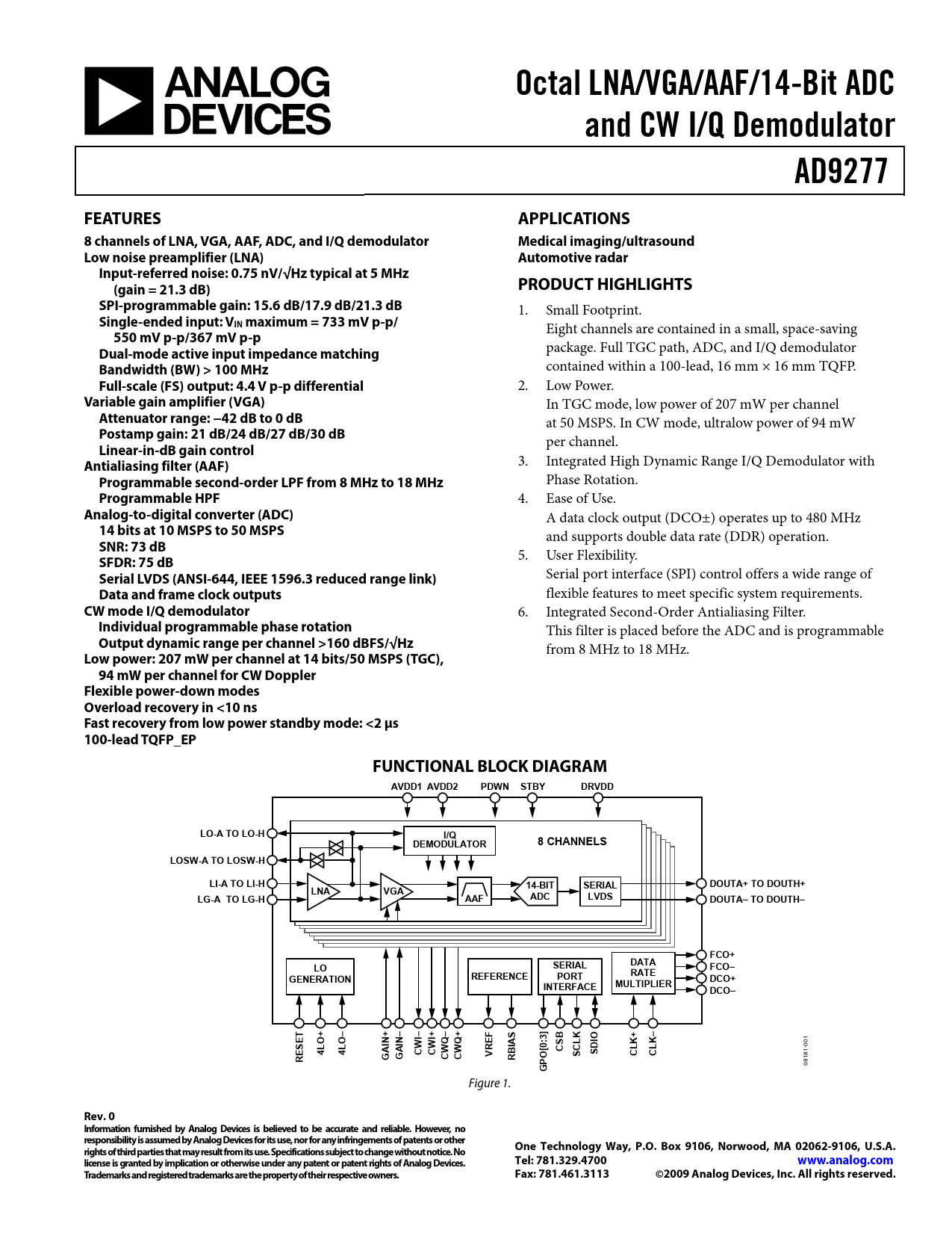 Octal LNA/VGA/AAF/14-Bit ADC and CW I/Q Demodulator AD9277 FEATURES APPLICATIONS 8 channels of LNA, VGA, AAF, ADC, and I/Q demodulator Medical imaging/ultrasound Low noise preamplifier (LNA) Automotive radar Input-referred noise: 0.75 nV/√Hz typical at 5 MHz (gain = 21.3 dB) PRODUCT HIGHLIGHTS SPI-programmable gain: 15.6 dB/17.9 dB/21.3 dB