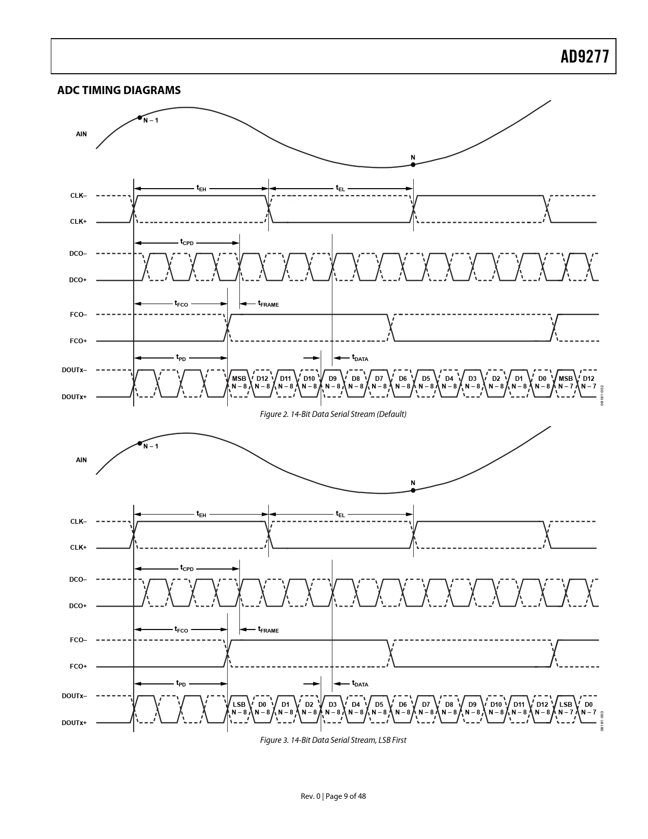 AD9277. ADC TIMING DIAGRAMS. N – 1. AIN. tEH. tEL. CLK–. CLK+. tCPD. DCO–. DCO+. tFCO. tFRAME. FCO–. FCO+. tPD. tDATA. DOUTx–. MSB. D12. D11. D10. N – 8. N – 7. DOUTx+