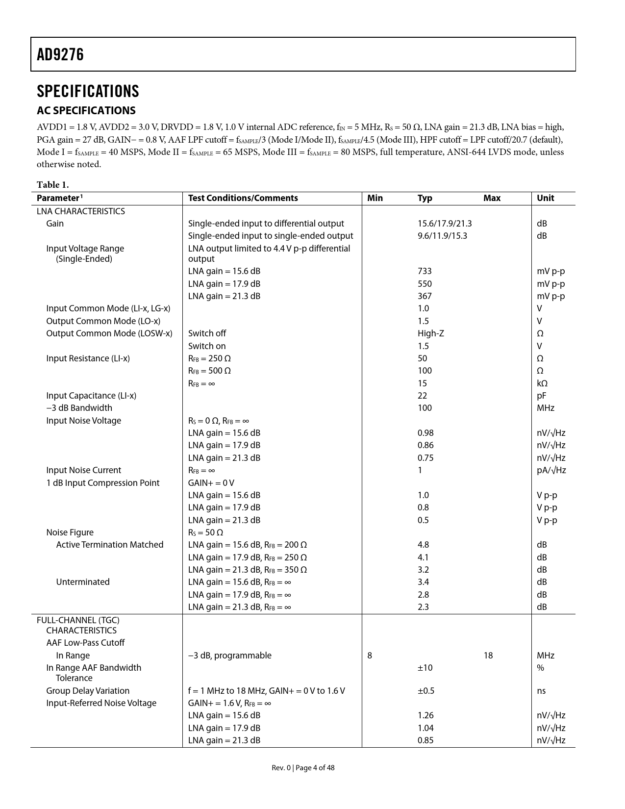 | Páginas / Página | 48 / 4 — AD9276. SPECIFICATIONS AC SPECIFICATIONS. Table 1. Parameter1. Test … |