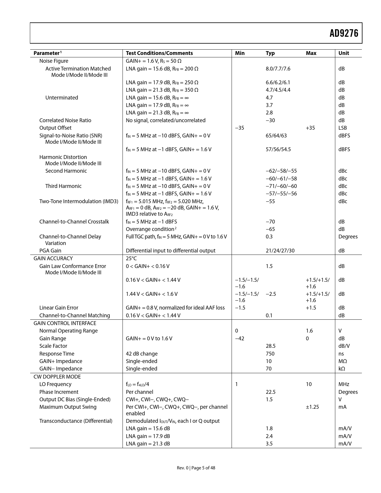 Páginas / Página48 / 5 — AD9276. Parameter1. Test Conditions/Comments. Min. Typ. Max. Unit