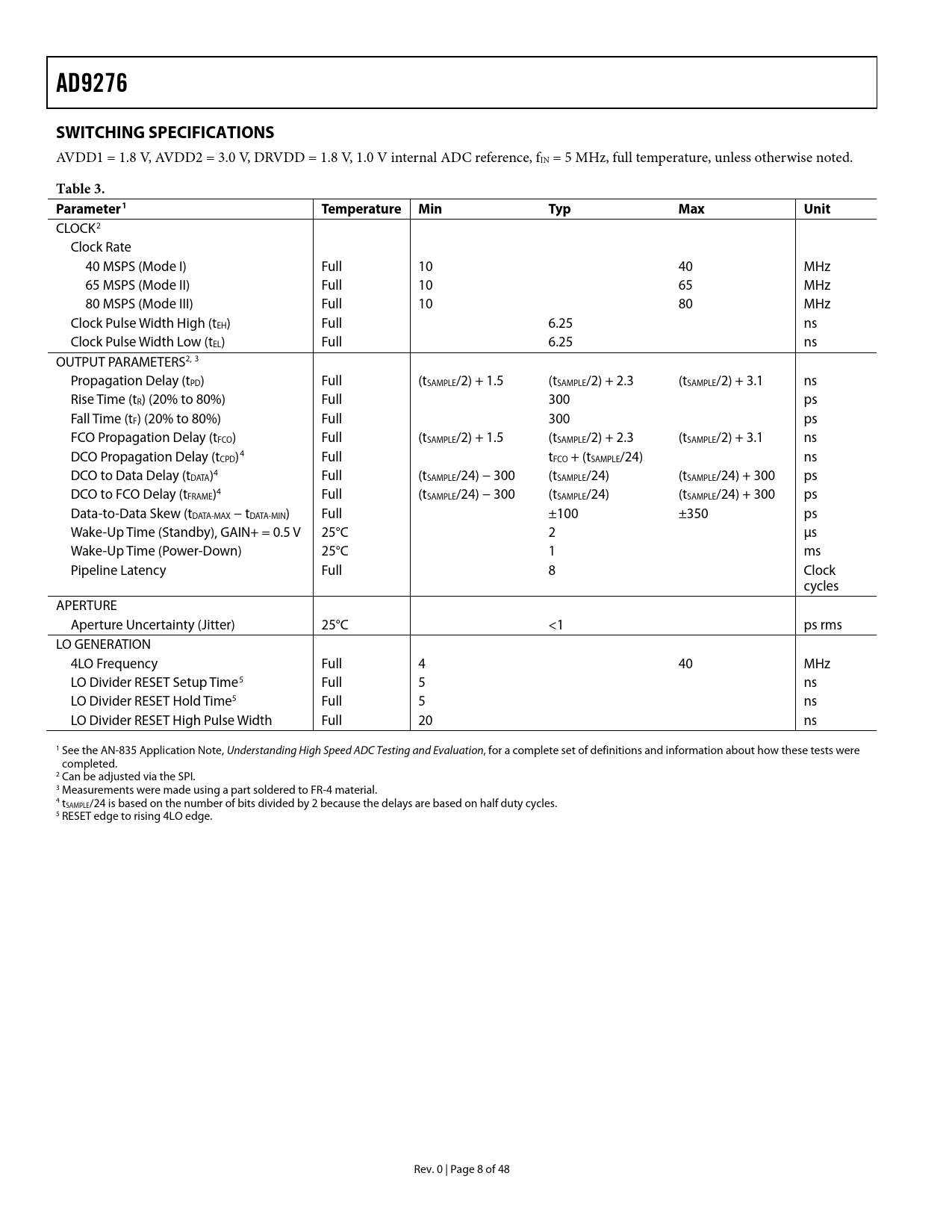 Páginas / Página48 / 8 — AD9276. SWITCHING SPECIFICATIONS. Table 3. Parameter1. Temperature Min. …
