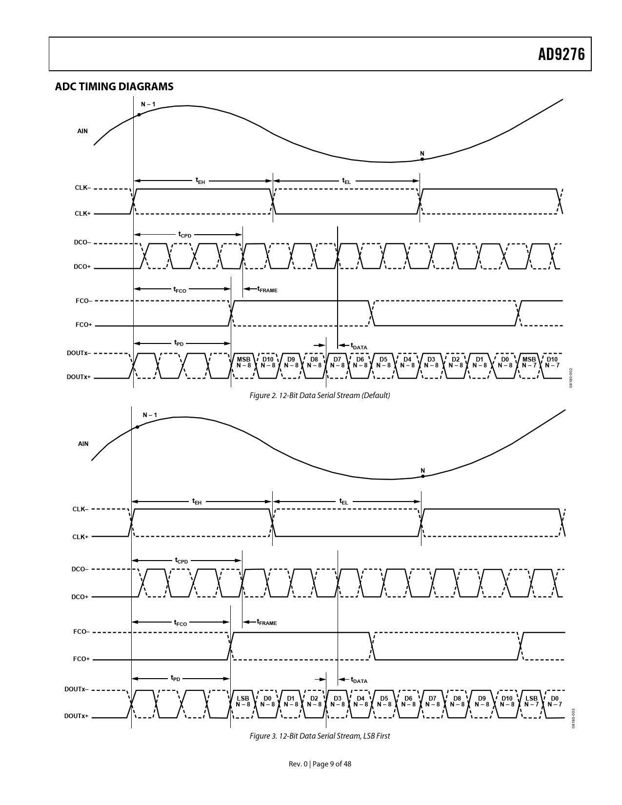 AD9276. ADC TIMING DIAGRAMS. N – 1. AIN. tEH. tEL. CLK–. CLK+. tCPD. DCO–. DCO+. FCO. FRAME. FCO–. FCO+. tPD. tDATA. DOUTx–. MSB. D10. N – 8. N – 7. DOUTx+. LSB