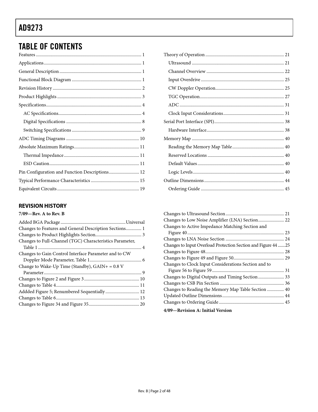link to page 1 link to page 1 link to page 1 link to page 1 link to page 2 link to page 3 link to page 4 link to page 4 link to page 8 link to page 9 link to page 10 link to page 11 link to page 11 link to page 11 link to page 12 link to page 15 link to page 19 link to page 21 link to page 21 link to page 22 link to page 25 link to page 25 link to page 27 link to page 31 link to page 31 link to page 38 link to page 38 link to page 40 link to page 40 link to page 40 link to page 40 link to page 40 link to page 44 link to page 45 AD9273TABLE OF CONTENTS Features .. 1 Theory of Operation .. 21 Applications ... 1 Ultrasound .. 21 General Description ... 1 Channel Overview ... 22 Functional Block Diagram .. 1 Input Overdrive .. 25 Revision History ... 2 CW Doppler Operation ... 25 Product Highlights ... 3 TGC Operation ... 27 Specifications ... 4 ADC ... 31 AC Specifications .. 4 Clock Input Considerations .. 31 Digital Specifications ... 8 Serial Port Interface (SPI) .. 38 Switching Specifications .. 9 Hardware Interface ... 38 ADC Timing Diagrams ... 10 Memory Map .. 40 Absolute Maximum Ratings .. 11 Reading the Memory Map Table .. 40 Thermal Impedance ... 11 Reserved Locations .. 40 ESD Caution .. 11 Default Values ... 40 Pin Configuration and Function Descriptions ... 12 Logic Levels ... 40 Typical Performance Characteristics ... 15 Outline Dimensions ... 44 Equivalent Circuits ... 19 Ordering Guide .. 45 REVISION HISTORY7/09—Rev. A to Rev. B Changes to Ultrasound Section .. 21 Added BGA Package .. Universal Changes to Low Noise Amplifier (LNA) Section ... 22 Changes to Features and General Description Sections .. 1 Changes to Active Impedance Matching Section and Changes to Product Highlights Section ... 3 Figure 40 .. 23 Changes to Full-Channel (TGC) Characteristics Parameter, Changes to LNA Noise Section .. 24 Table 1 .. 4 Changes to Input Overload Protection Section and Figure 44 ... 25 Changes to Gain Control Interface Parameter and to CW Changes to Figure 48 .. 28 Doppler Mode Parameter, Table 1 .. 6 Changes to Figure 49 and Figure 50... 29 Change to Wake-Up Time (Standby), GAIN+ = 0.8 V Changes to Clock Input Considerations Section and to Parameter ... 9 Figure 56 to Figure 59 .. 31 Changes to Figure 2 and Figure 3 ... 10 Changes to Digital Outputs and Timing Section ... 33 Changes to Table 4 .. 11 Changes to CSB Pin Section ... 36 Addded Figure 5; Renumbered Sequentially .. 12 Changes to Reading the Memory Map Table Section ... 40 Changes to Table 6 .. 13 Updated Outline Dimensions ... 44 Changes to Figure 34 and Figure 35 ... 20 Changes to Ordering Guide .. 45 4/09—Revision A: Initial Version Rev. B | Page 2 of 48 Document Outline FEATURES APPLICATIONS GENERAL DESCRIPTION FUNCTIONAL BLOCK DIAGRAM TABLE OF CONTENTS REVISION HISTORY PRODUCT HIGHLIGHTS SPECIFICATIONS AC SPECIFICATIONS DIGITAL SPECIFICATIONS SWITCHING SPECIFICATIONS ADC TIMING DIAGRAMS ABSOLUTE MAXIMUM RATINGS THERMAL IMPEDANCE ESD CAUTION PIN CONFIGURATION AND FUNCTION DESCRIPTIONS TYPICAL PERFORMANCE CHARACTERISTICS EQUIVALENT CIRCUITS THEORY OF OPERATION ULTRASOUND CHANNEL OVERVIEW Low Noise Amplifier (LNA) Recommendation Active Impedance Matching LNA Noise INPUT OVERDRIVE Input Overload Protection CW DOPPLER OPERATION Crosspoint Switch TGC OPERATION Variable Gain Amplifier Gain Control VGA Noise Antialiasing Filter ADC CLOCK INPUT CONSIDERATIONS Clock Duty Cycle Considerations Clock Jitter Considerations Power Dissipation and Power-Down Mode Digital Outputs and Timing SDIO Pin SCLK Pin CSB Pin RBIAS Pin Voltage Reference Power and Ground Recommendations Exposed Paddle Thermal Heat Slug Recommendations SERIAL PORT INTERFACE (SPI) HARDWARE INTERFACE MEMORY MAP READING THE MEMORY MAP TABLE Caution RESERVED LOCATIONS DEFAULT VALUES LOGIC LEVELS OUTLINE DIMENSIONS ORDERING GUIDE