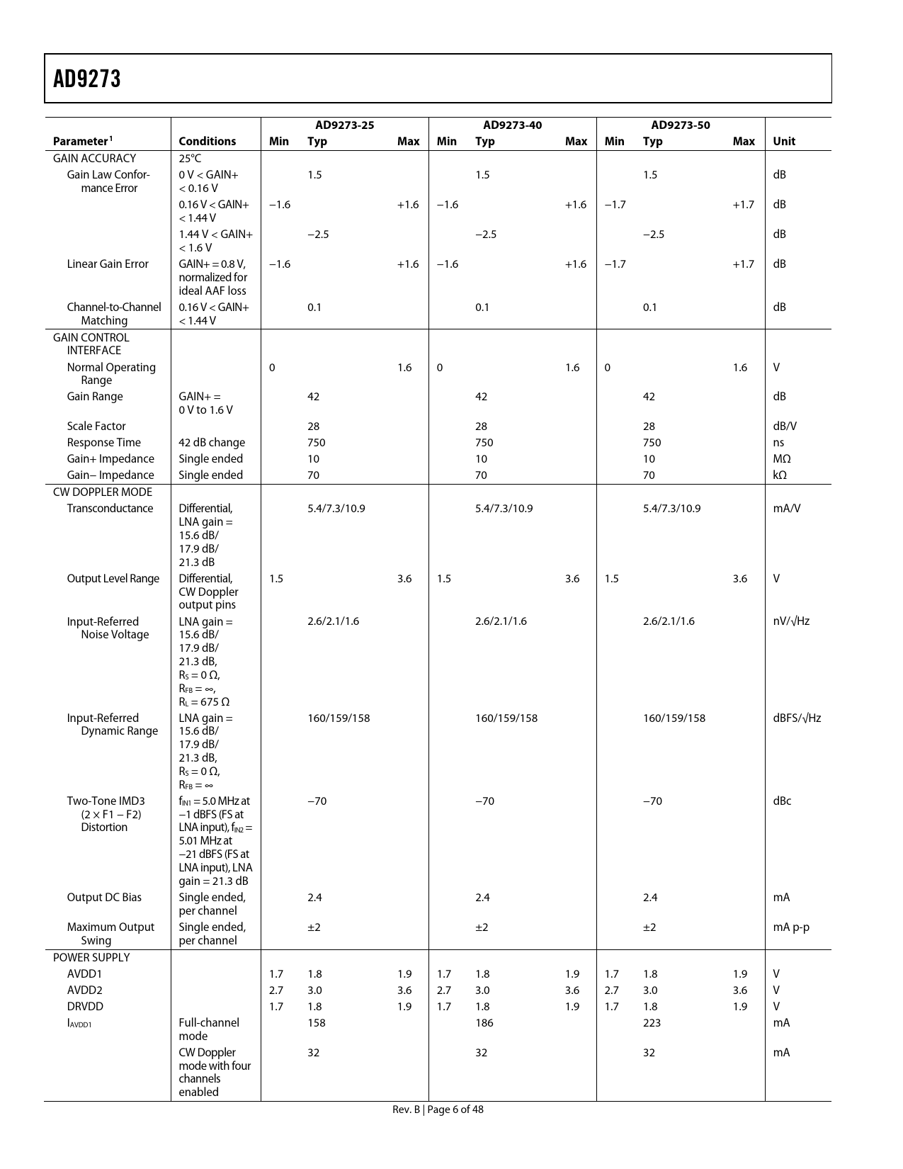 AD9273 AD9273-25 AD9273-40 AD9273-50 Parameter1 Conditions Min Typ Max Min Typ Max Min Typ Max Unit