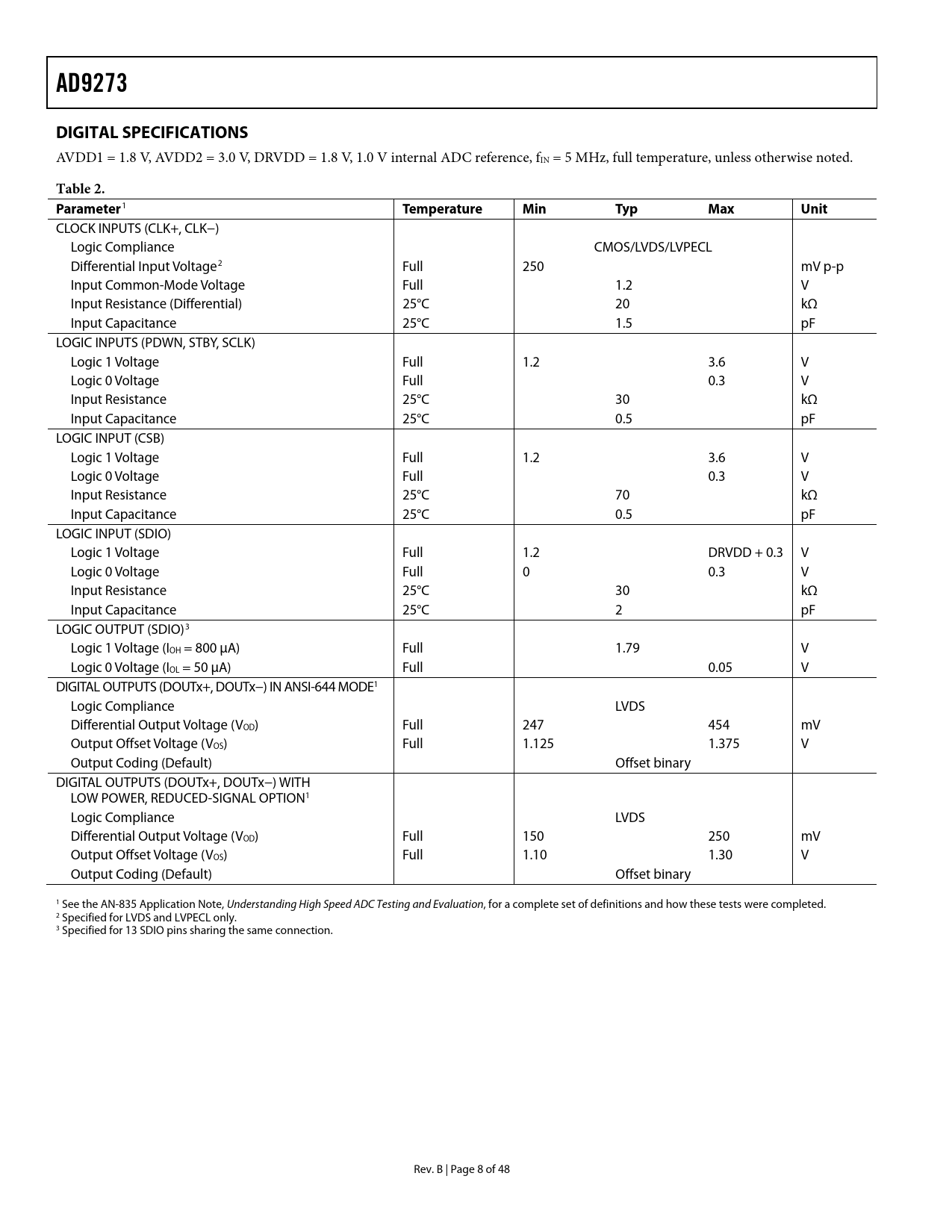 link to page 8 link to page 8 link to page 8 link to page 8 link to page 8 AD9273DIGITAL SPECIFICATIONS AVDD1 = 1.8 V, AVDD2 = 3.0 V, DRVDD = 1.8 V, 1.0 V internal ADC reference, fIN = 5 MHz, full temperature, unless otherwise noted. Table 2. Parameter 1 Temperature MinTypMaxUnit CLOCK INPUTS (CLK+, CLK−) Logic Compliance CMOS/LVDS/LVPECL Differential Input Voltage2 Full 250 mV p-p Input Common-Mode Voltage Full 1.2 V Input Resistance (Differential) 25°C 20 kΩ Input Capacitance 25°C 1.5 pF LOGIC INPUTS (PDWN, STBY, SCLK) Logic 1 Voltage Full 1.2 3.6 V Logic 0 Voltage Full 0.3 V Input Resistance 25°C 30 kΩ Input Capacitance 25°C 0.5 pF LOGIC INPUT (CSB) Logic 1 Voltage Full 1.2 3.6 V Logic 0 Voltage Full 0.3 V Input Resistance 25°C 70 kΩ Input Capacitance 25°C 0.5 pF LOGIC INPUT (SDIO) Logic 1 Voltage Full 1.2 DRVDD + 0.3 V Logic 0 Voltage Full 0 0.3 V Input Resistance 25°C 30 kΩ Input Capacitance 25°C 2 pF LOGIC OUTPUT (SDIO)3 Logic 1 Voltage (IOH = 800 μA) Full 1.79 V Logic 0 Voltage (IOL = 50 μA) Full 0.05 V DIGITAL OUTPUTS (DOUTx+, DOUTx−) IN ANSI-644 MODE1 Logic Compliance LVDS Differential Output Voltage (VOD) Full 247 454 mV Output Offset Voltage (VOS) Full 1.125 1.375 V Output Coding (Default) Offset binary DIGITAL OUTPUTS (DOUTx+, DOUTx−) WITH LOW POWER, REDUCED-SIGNAL OPTION1 Logic Compliance LVDS Differential Output Voltage (VOD) Full 150 250 mV Output Offset Voltage (VOS) Full 1.10 1.30 V Output Coding (Default) Offset binary 1 See the AN-835 Application Note, Understanding High Speed ADC Testing and Evaluation, for a complete set of definitions and how these tests were completed. 2 Specified for LVDS and LVPECL only. 3 Specified for 13 SDIO pins sharing the same connection. Rev. B | Page 8 of 48 Document Outline FEATURES APPLICATIONS GENERAL DESCRIPTION FUNCTIONAL BLOCK DIAGRAM TABLE OF CONTENTS REVISION HISTORY PRODUCT HIGHLIGHTS SPECIFICATIONS AC SPECIFICATIONS DIGITAL SPECIFICATIONS SWITCHING SPECIFICATIONS ADC TIMING DIAGRAMS ABSOLUTE MAXIMUM RATINGS THERMAL IMPEDANCE ESD CAUTION PIN CONFIGURATION AND FUNCTION DESCRIPTIONS TYPICAL PERFORMANCE CHARACTERISTICS EQUIVALENT CIRCUITS THEORY OF OPERATION ULTRASOUND CHANNEL OVERVIEW Low Noise Amplifier (LNA) Recommendation Active Impedance Matching LNA Noise INPUT OVERDRIVE Input Overload Protection CW DOPPLER OPERATION Crosspoint Switch TGC OPERATION Variable Gain Amplifier Gain Control VGA Noise Antialiasing Filter ADC CLOCK INPUT CONSIDERATIONS Clock Duty Cycle Considerations Clock Jitter Considerations Power Dissipation and Power-Down Mode Digital Outputs and Timing SDIO Pin SCLK Pin CSB Pin RBIAS Pin Voltage Reference Power and Ground Recommendations Exposed Paddle Thermal Heat Slug Recommendations SERIAL PORT INTERFACE (SPI) HARDWARE INTERFACE MEMORY MAP READING THE MEMORY MAP TABLE Caution RESERVED LOCATIONS DEFAULT VALUES LOGIC LEVELS OUTLINE DIMENSIONS ORDERING GUIDE