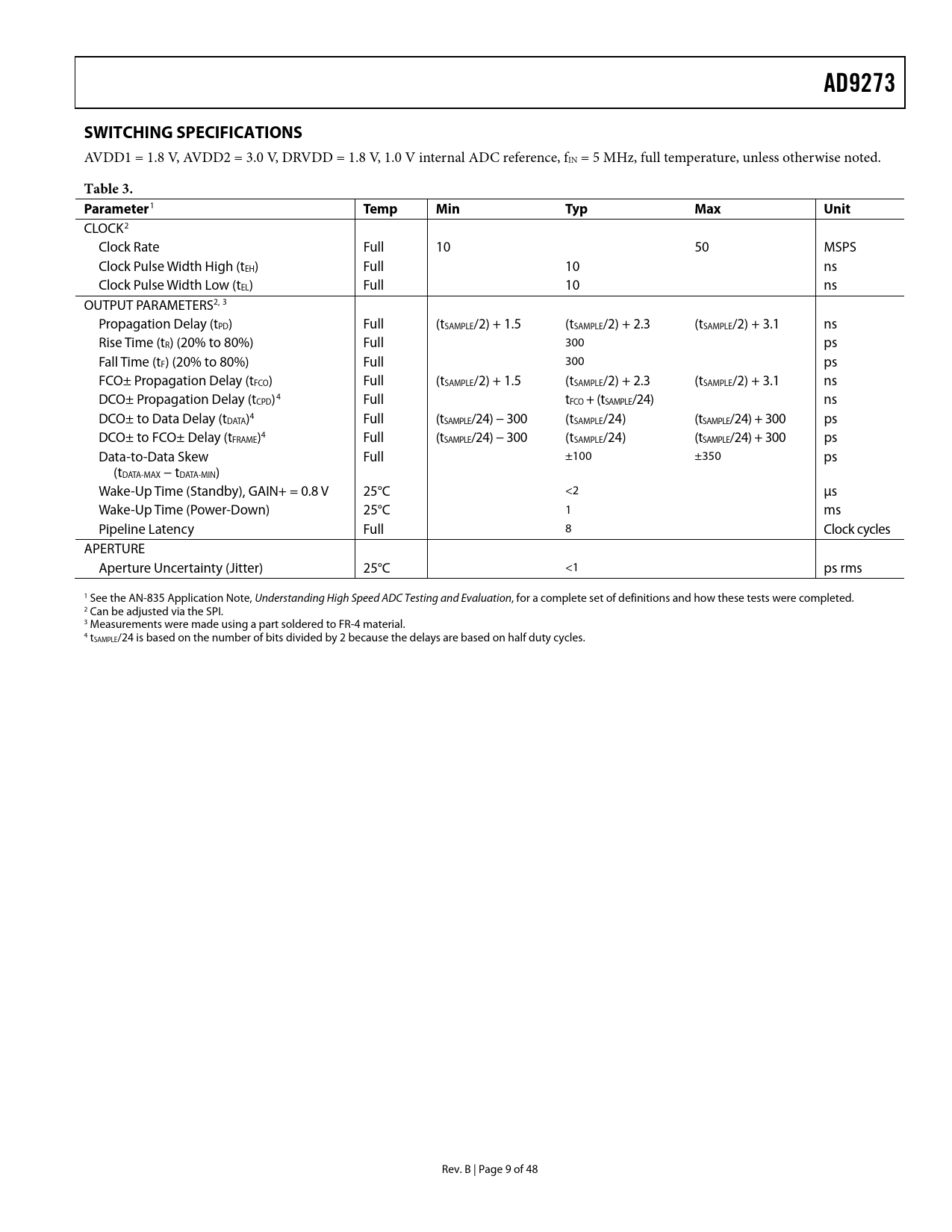 link to page 9 link to page 9 link to page 9 link to page 9 link to page 9 link to page 9 link to page 9 AD9273SWITCHING SPECIFICATIONS AVDD1 = 1.8 V, AVDD2 = 3.0 V, DRVDD = 1.8 V, 1.0 V internal ADC reference, fIN = 5 MHz, full temperature, unless otherwise noted. Table 3. Parameter 1 Temp MinTypMaxUnit CLOCK2 Clock Rate Full 10 50 MSPS Clock Pulse Width High (tEH) Full 10 ns Clock Pulse Width Low (tEL) Full 10 ns OUTPUT PARAMETERS2, 3 Propagation Delay (tPD) Full (tSAMPLE/2) + 1.5 (tSAMPLE/2) + 2.3 (tSAMPLE/2) + 3.1 ns Rise Time (tR) (20% to 80%) Full 300 ps Fall Time (tF) (20% to 80%) Full 300 ps FCO± Propagation Delay (tFCO) Full (tSAMPLE/2) + 1.5 (tSAMPLE/2) + 2.3 (tSAMPLE/2) + 3.1 ns DCO± Propagation Delay (tCPD)4 Full tFCO + (tSAMPLE/24) ns DCO± to Data Delay (tDATA)4 Full (tSAMPLE/24) − 300 (tSAMPLE/24) (tSAMPLE/24) + 300 ps DCO± to FCO± Delay (tFRAME)4 Full (tSAMPLE/24) − 300 (tSAMPLE/24) (tSAMPLE/24) + 300 ps Data-to-Data Skew Full ±100 ±350 ps (tDATA-MAX − tDATA-MIN) Wake-Up Time (Standby), GAIN+ = 0.8 V 25°C <2 μs Wake-Up Time (Power-Down) 25°C 1 ms Pipeline Latency Full 8 Clock cycles APERTURE Aperture Uncertainty (Jitter) 25°C <1 ps rms 1 See the AN-835 Application Note, Understanding High Speed ADC Testing and Evaluation, for a complete set of definitions and how these tests were completed. 2 Can be adjusted via the SPI. 3 Measurements were made using a part soldered to FR-4 material. 4 tSAMPLE/24 is based on the number of bits divided by 2 because the delays are based on half duty cycles. Rev. B | Page 9 of 48 Document Outline FEATURES APPLICATIONS GENERAL DESCRIPTION FUNCTIONAL BLOCK DIAGRAM TABLE OF CONTENTS REVISION HISTORY PRODUCT HIGHLIGHTS SPECIFICATIONS AC SPECIFICATIONS DIGITAL SPECIFICATIONS SWITCHING SPECIFICATIONS ADC TIMING DIAGRAMS ABSOLUTE MAXIMUM RATINGS THERMAL IMPEDANCE ESD CAUTION PIN CONFIGURATION AND FUNCTION DESCRIPTIONS TYPICAL PERFORMANCE CHARACTERISTICS EQUIVALENT CIRCUITS THEORY OF OPERATION ULTRASOUND CHANNEL OVERVIEW Low Noise Amplifier (LNA) Recommendation Active Impedance Matching LNA Noise INPUT OVERDRIVE Input Overload Protection CW DOPPLER OPERATION Crosspoint Switch TGC OPERATION Variable Gain Amplifier Gain Control VGA Noise Antialiasing Filter ADC CLOCK INPUT CONSIDERATIONS Clock Duty Cycle Considerations Clock Jitter Considerations Power Dissipation and Power-Down Mode Digital Outputs and Timing SDIO Pin SCLK Pin CSB Pin RBIAS Pin Voltage Reference Power and Ground Recommendations Exposed Paddle Thermal Heat Slug Recommendations SERIAL PORT INTERFACE (SPI) HARDWARE INTERFACE MEMORY MAP READING THE MEMORY MAP TABLE Caution RESERVED LOCATIONS DEFAULT VALUES LOGIC LEVELS OUTLINE DIMENSIONS ORDERING GUIDE